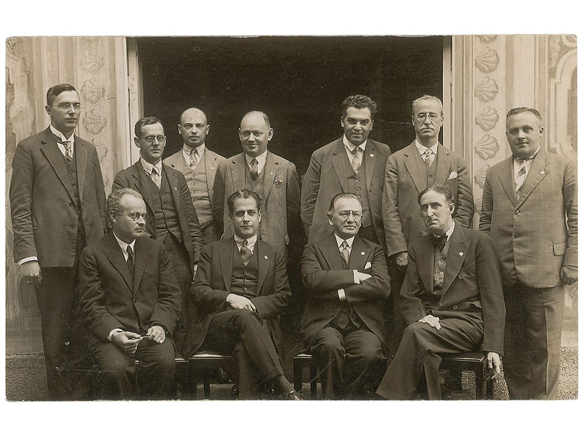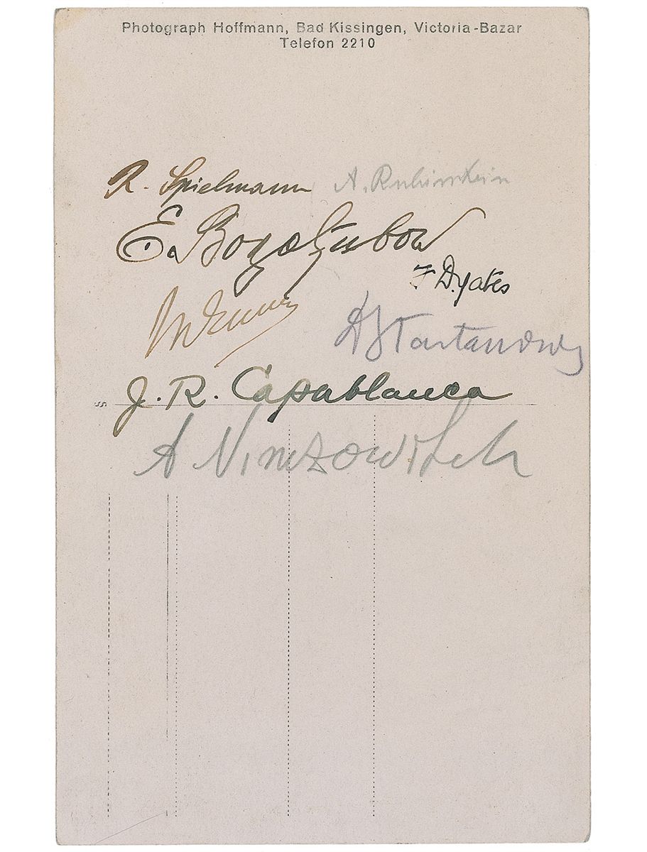 Excessively rare glossy 5.5 x 3.5 postcard photo of the competitors at the 1928 all-star chess tournament in Bad Kissingen, Germany, signed on the reverse in fountain pen and pencil by Efim Bogoljubov, Jose Raul Capablanca, Rudolf Spielmann, Savielly Tartakower, Akiba Rubinstein, Frederick Yates, Max Euwe, and Aron Nimzowitsch. In fine condition. An outstanding assemblage of the greatest chess masters of the era, rarely found in this format and combination.