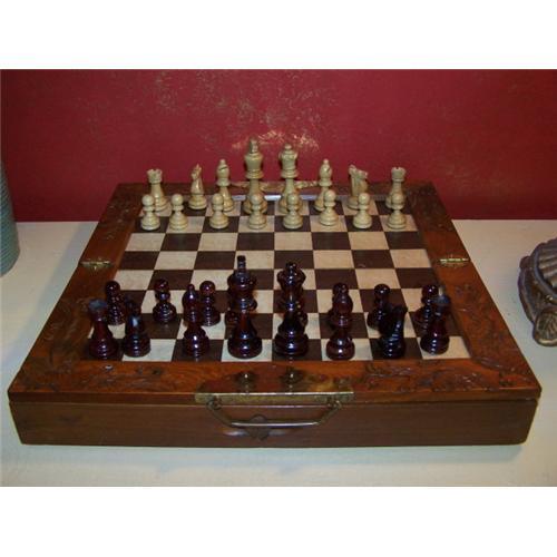 Beautiful Oriental Hand Carved Chess Set and box. Two drawers. Rich wood. Brass orniment.