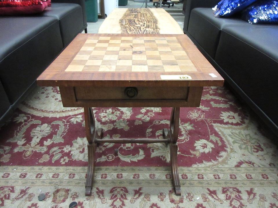 Has a drawer for chess pieces. 18" x 18" x 20" tall.