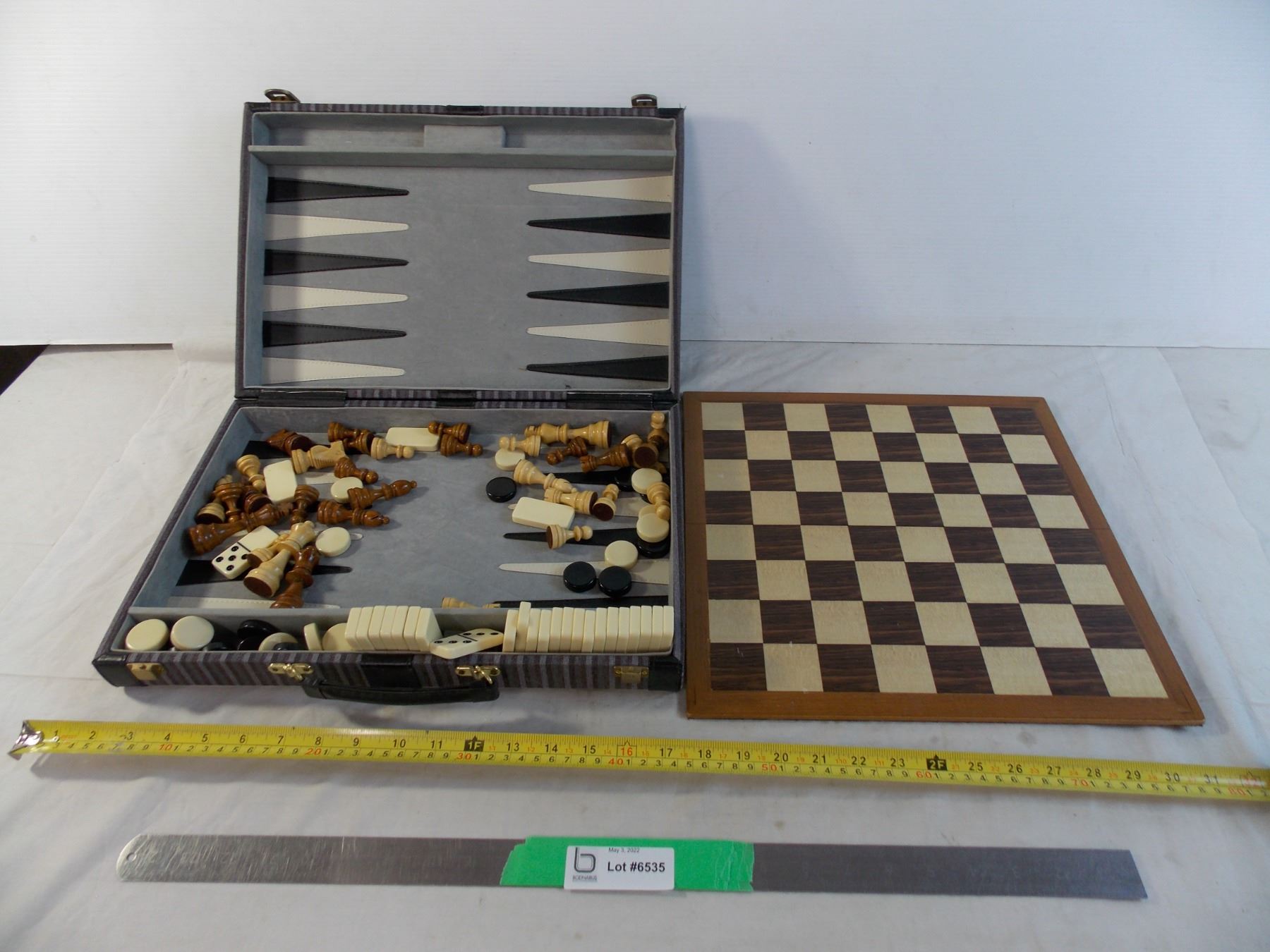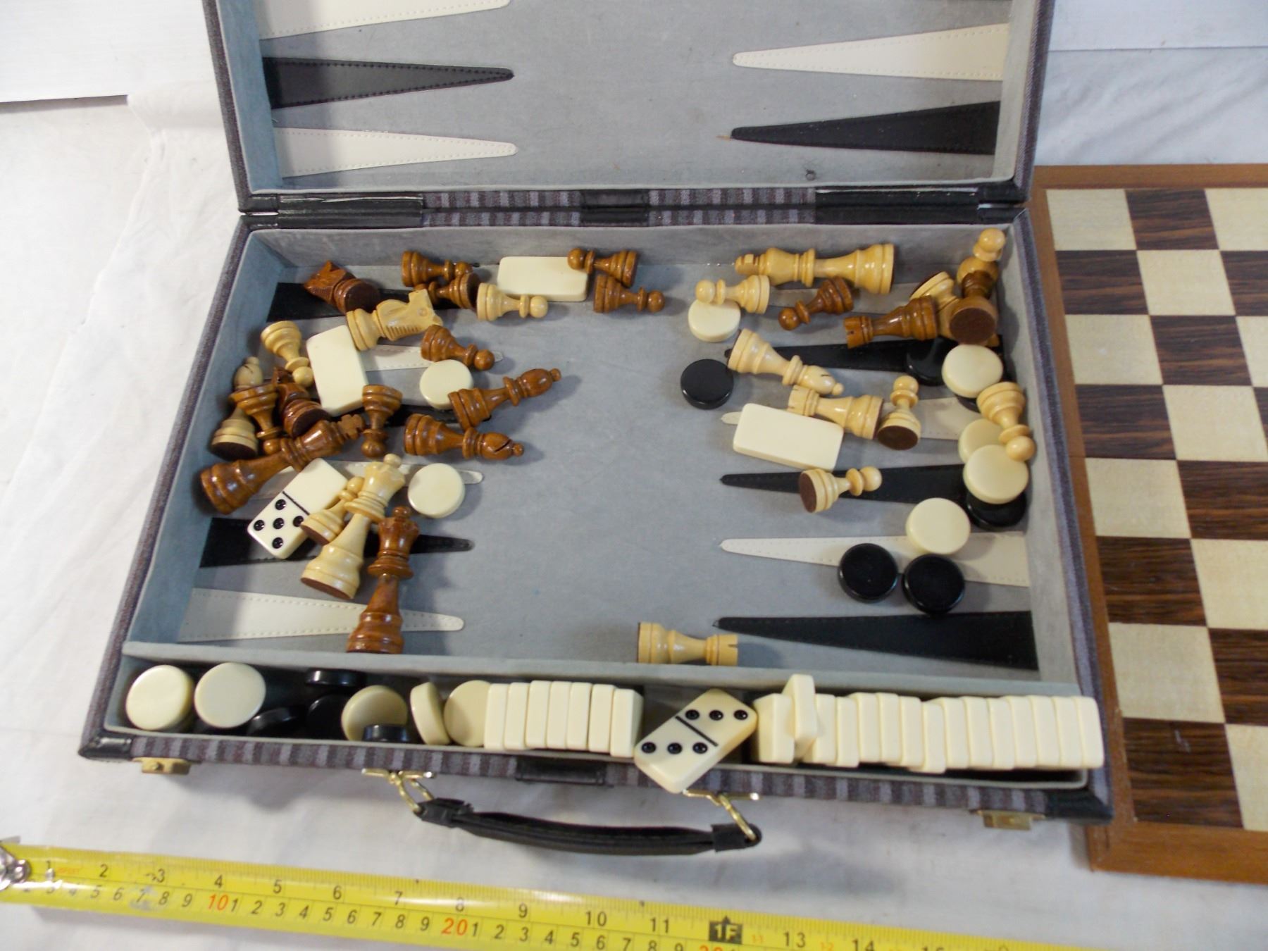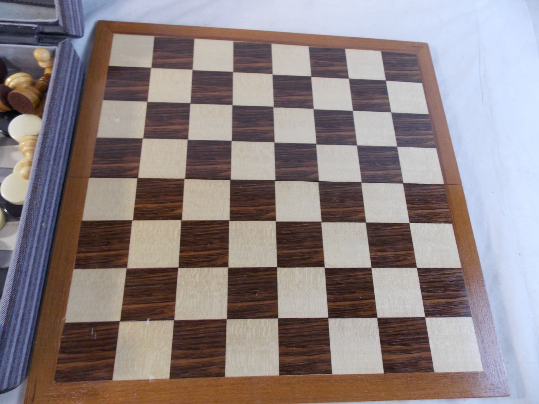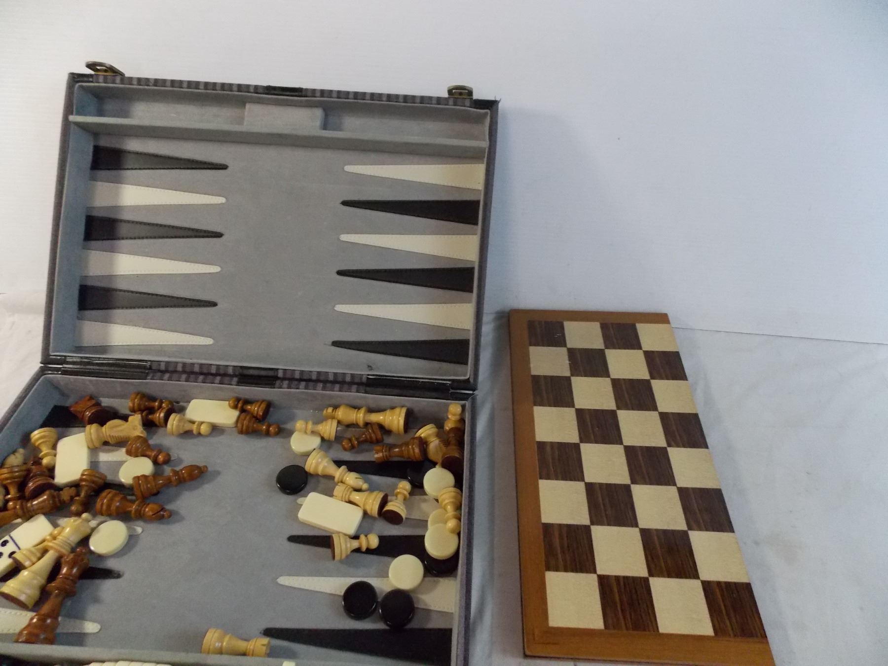 Chess pieces + wood board in backgammon case