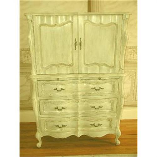 Additional photos available.Fabulous C.1920 antique white or cream chest on chest,valet or entertainment cabinet offers three divided 5.5 inch deep drawers in the top portion with hand pulls neatly tucked behind the double doors with recessed panels on inside and out. Decorative hardware and magnetic catch. These could also be removed to use as an entertainment center. A pull out folding wooden tray with decorative knobs for folding sweaters,etc. sdeparates the top and bottom three 6" deep drawers with French hardware and scroll work around the face of each. Sides of the chest have same decorative panels,mitered corners with convex trim on front and back corners,making it just as attractive from the side view. Stands on short cabriole legs and escargot feet. Aged finish in wonderful condition and color with slightly worn edges. Excellent condition overall. Measures 57.5H X 21D X 38.5L.