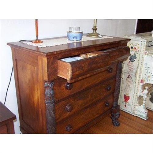 </font></strong>Early Empire Mahogany Chest of Drawers, Circa 1840-1860. Handsome Cuban Style Acanthus Carved Leaf Columns framing long drawers below two rounded front ovola molded short drawers. Fine detailed lions foot carved legs support the finely hand-made dovetailed large drawers. Beautiful flamed mahogany book-matched veneer on front side of drawers.</font>