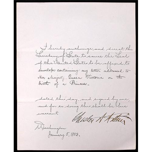 <Our item number 135779><B>Arthur, Chester A.</B> Document signed as President, 1p. with integral blank leaf, 10 x 8 in., Washington, 5 Jan. 1883. Authorizing and directing the Secretary of State to affix the Seal of the United States to an "envelope containing my letter addressed to Her Majesty Queen Victoria on the birth of a Princess." Fine; large bold signature with some contemporary ink brushing. Arthur's signature is scarce in this form. <BR>Estimated Value $800 - 1,000. <I><BR>Purchased from the late autograph dealer, Doris Harris, in 1969.</I> <BR><BR>Our item number 135779<BR><IMAGES><P ALIGN="CENTER"><IMG SRC="http://www.goldbergcoins.net/liveauction/49jpegs/135779.jpg"> </P></IMAGES>