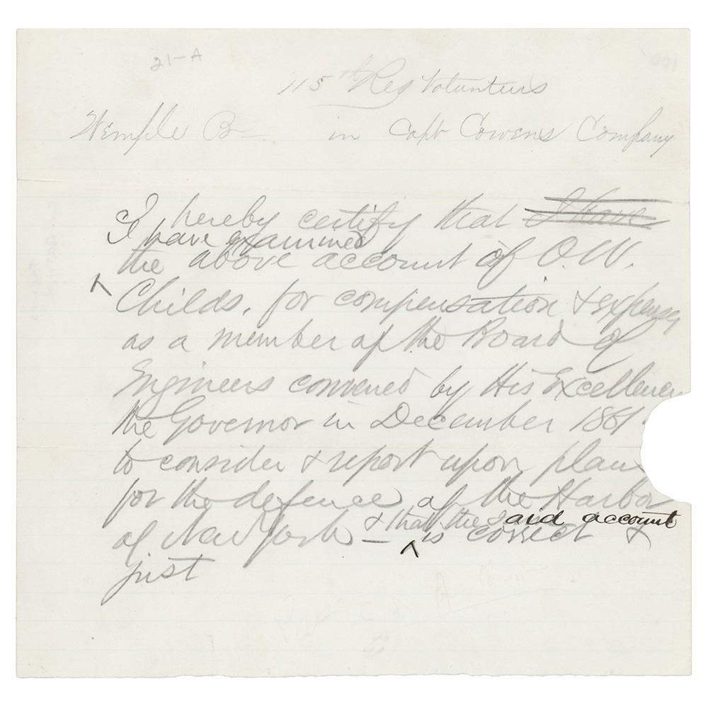 Civil War-era handwritten draft of a document in pencil by Arthur, unsigned, one page, 7.75 x 7.5, no date. Document pertaining to the 115th Reg. Volunteers (the “Iron Hearted Regiment”) in Captain Cowen’s Company. Arthur writes: "I hereby certify that I have examined the above account of O. W. Childs, for compensation & expenses, as a member of the Board of Engineers convened by His Excellency the Governor in December 1861 to consider & report upon plans for the defence of the Harbor of New York—and that the said account is correct and just" In very good to fine condition, with splitting to the ends of the folds, and a semicircular area of paper loss to the right edge, affecting a couple of words.