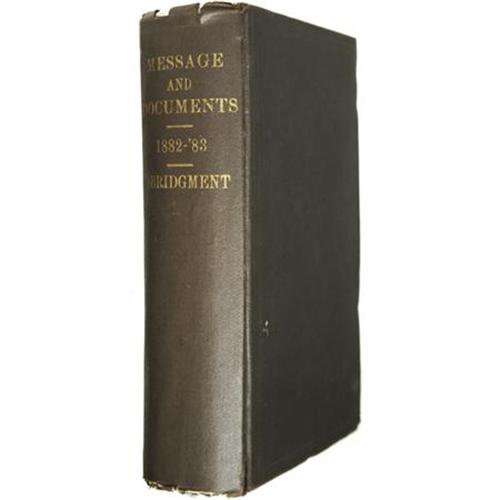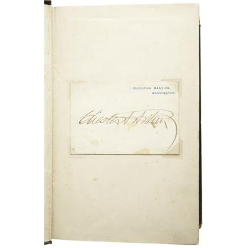 <B>Chester A. Arthur, </B></I><B><I>Message from the President of the United States to the Two Houses of Congress at the Commencement of the Second Session of the Forty-Seventh Congress</B></I></B></I> <B>with Signed Card</B></I> (Washington: Government Printing Office, 1882), first edition, 1019 pages, black-cloth binding with gold lettering, 8vo (9.25” x 6”). This transcription of President Arthur’s address to the 47th Congress, delivered early in his term (1881-1885), is appended by “Reports of the Heads of Departments and Selections from Accompanying Documents.” Arthur’s “Executive Mansion” card, signed <I>“Chester A. Arthur”</B></I>, is attached to the front endpaper with mylar corners. The book is in good condition with moderate wear on the binding and acidification in the paper; the autograph is good with some fading and small stains on the card. <BR><BR><b>Shipping:</b> Books & Catalogs (<a target="_blank" href="http://www.heritageauctions.com/common/shipping.php">view shipping information</a>)