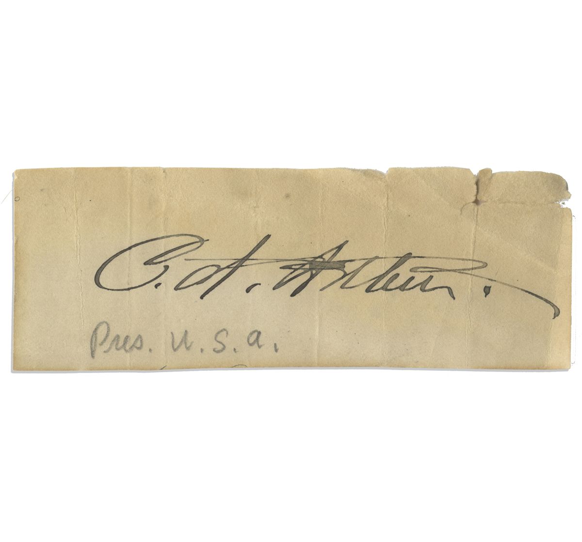 Chester A. Arthur signature, ''C. A. Arthur'' in black ink. Signed slip measures 4.25'' x 1.5''. Toning, chipping to upper right and pencil notation, else near fine.