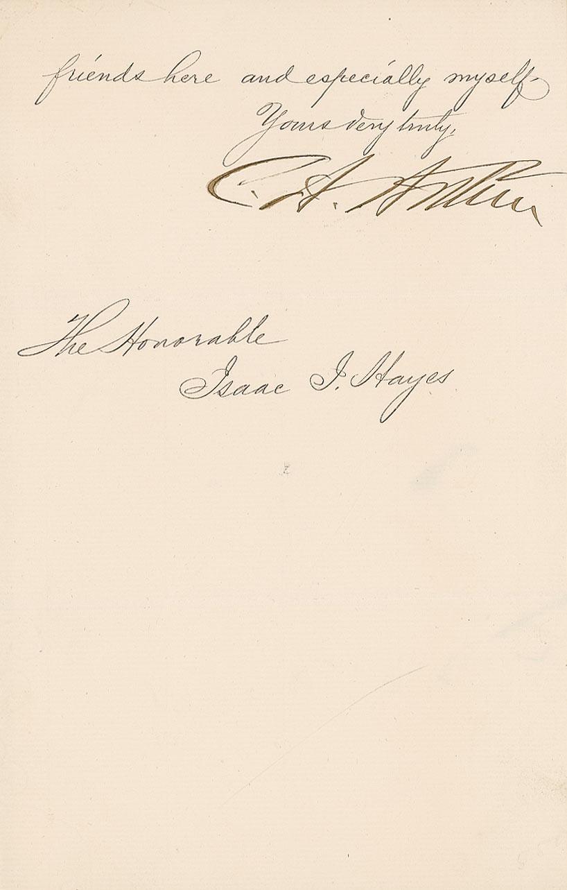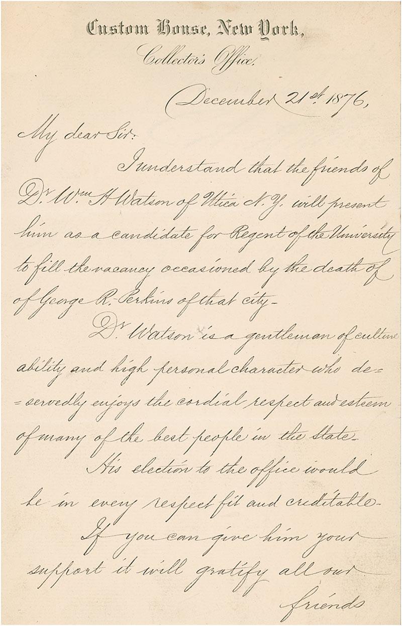 LS signed “C. A. Arthur,” one page, 6 x 9, December 21, 1876. Letter to Isaac Hayes. In part: “I understand that the friends of Dr. Wm. H. Watson of Utica, N.Y. will present him as a candidate for Regent of the University to fill the vacancy occasioned by the death of George R. Perkins of that city. Dr. Watson is a gentleman of culture, ability, and high personal character who deservedly enjoys the cordial respect and esteem of many of the best people in the state…. If you can give him your support it will gratify all our friends here and especially myself.” A touch of mild soiling and tiny pinhole to each page, otherwise fine condition. An eloquent endorsement from Arthur.