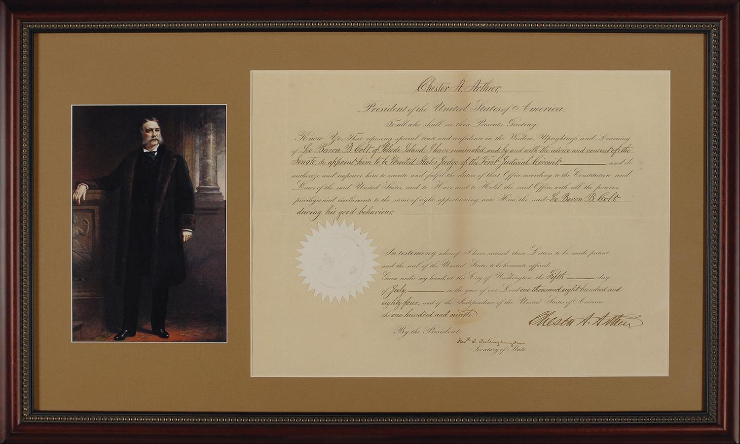 Partly-printed DS as president, signed “Chester A. Arthur,” one page, 17 x 12.5, July 5, 1884. In part: “LeBaron B. Colt of Rhode Island, I have nominated, and by and with the advice and consent of the Senate, do appoint him to be United States Judge of the First Judicial Circuit.” The large official seal is intact. Matted with a colorized full-length portrait to an overall size of 30.5 x 18.5. In fine condition, with intersecting folds, moderate vertical strip of toning, and some haloing of Arthur’s name. Presidential appointments are always desirable. LeBaron Colt would go on to serve as a US Senator. Oversized.