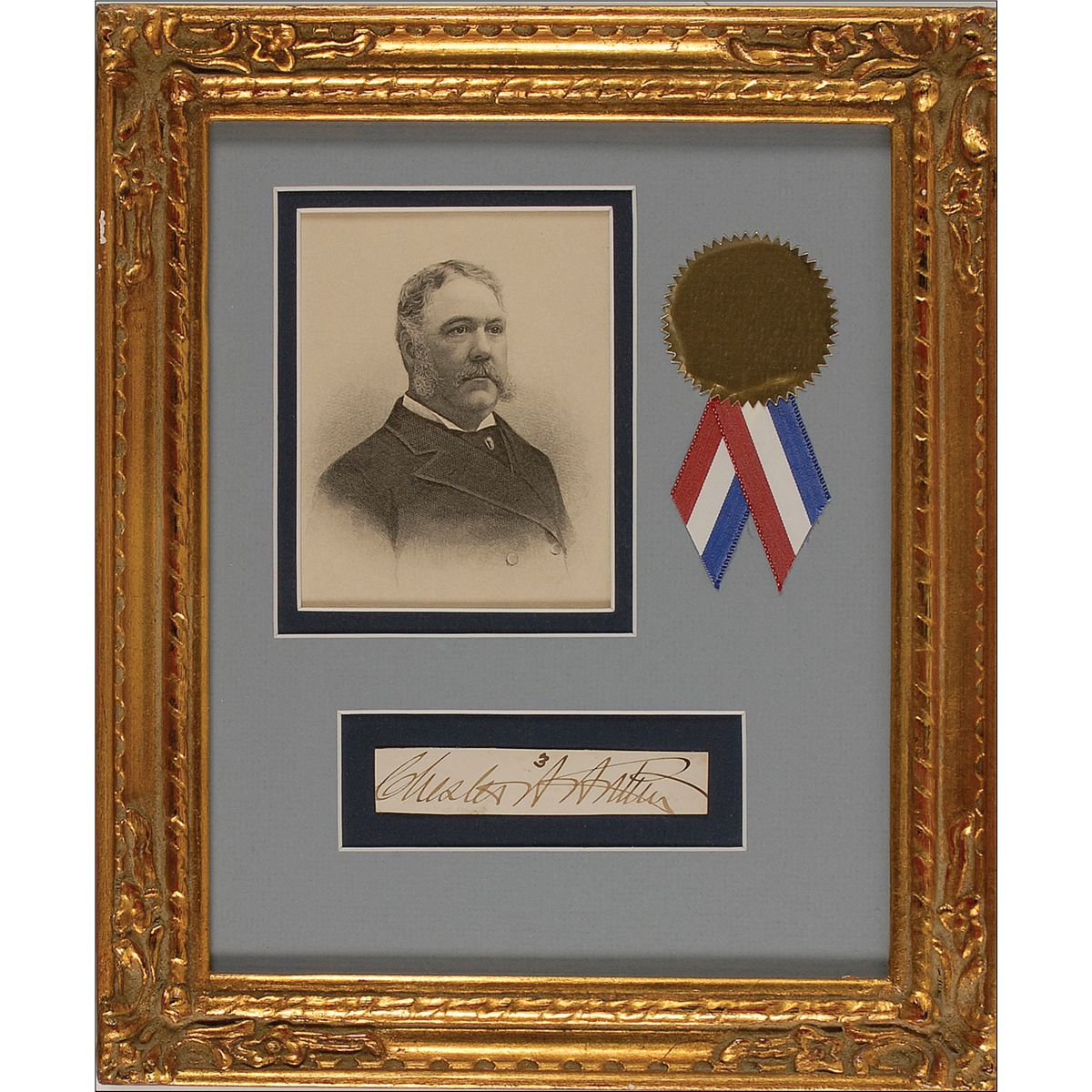 Ink signature, “Chester A. Arthur,” on an off-white 3.75 x .75 slip, with a “3” written above signature. Double matted and framed with an engraved portrait of Arthur and a gold foil seal and ribbon, to an overall size of 10 x 12. In fine condition, with a bit of scattered light soiling.