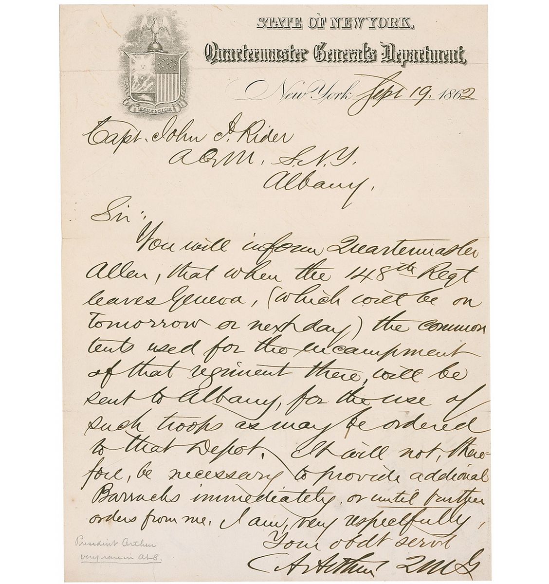 War-dated ALS signed “C. A. Arthur QMG,” one page, 8 x 11, State of New York Quartermaster General’s Department letterhead, September 19, 1862. Letter to Assistant Quartermaster General John J. Rider. In full: “You will inform Quartermaster Allen, that when the 148th Regt leaves Geneva (which will be on tomorrow or next day), the common tents used for the encampment of that regiment there, will be sent to Albany, for the use of such troops as way be ordered to that Depot. It will not, therefore, be necessary to provide additional barracks immediately, or until further orders from me.” Small tear to bottom edge, well away from signature, pencil notation to lower left, a trivial brush to one initial of signature, and some scattered light toning, otherwise fine condition.