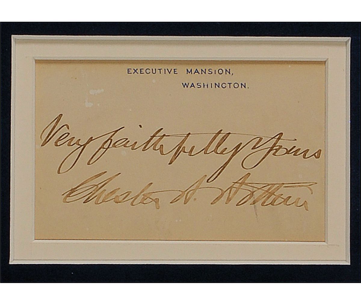 Executive Mansion card, signed in black ink, “Very faithfully yours, Chester A. Arthur.” Double suede matted and framed with a portrait of Arthur and a biographical plaque to an overall size of 16.25 x 25.5. In very good condition, with uniform toning, a bit of light soiling, a thin pencil line through portion of last name, and a few spots. Oversized.