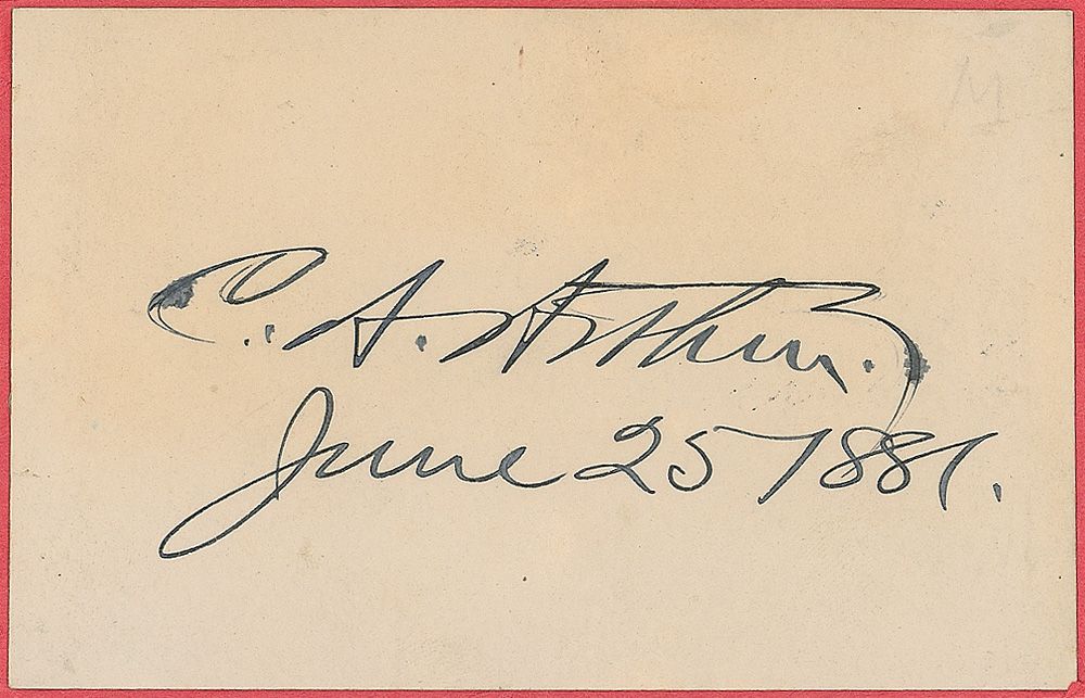 Ink signature, “C. A. Arthur, June 25, 1881,” on an off-white 4.25 x 2.75 card affixed to a slightly larger sheet. Scattered light toning and soiling, otherwise fine condition.