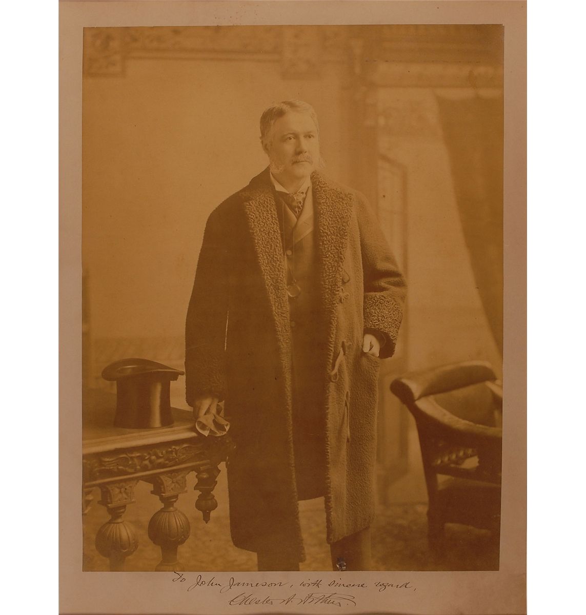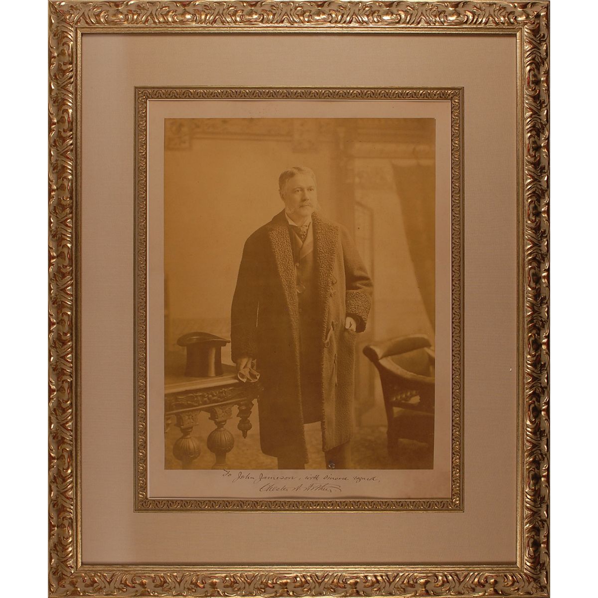 Magnificent sepia 18.25 x 24.25, imperial three-quarter-length, portrait by Charles Milton Bell, signed and inscribed as president in the lower border in black ink, “To John Jameson, with sincere regard, Chester A. Arthur.” Nicely cloth-matted and framed to an overall size of 31 x 37. Small repair to bottom of image, some light spotting to background, and some mild toning, soiling, and foxing to borders, otherwise fine condition. The John Jameson of Arthur’s inscription is most probably the Amherst, Massachusetts, lawyer who was appointed postmaster in December of 1876. Taken in 1882 during Arthur’s first year in office, images of the president are incredibly scarce, and photos of this size, in particular, are virtually nonexistent. Another striking feature of this particular photo is the man who took it: Charles Milton Bell. A celebrity in his own right, Bell established an acclaimed photography studio on Pennsylvania Avenue, and counted President Arthur among his elite clientele. Oversized.