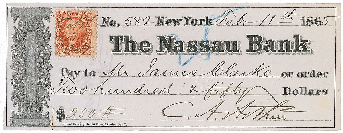 Bank check, 6.75 x 2.5, filled out in another hand and signed by Arthur, “C. A. Arthur,” payable to Mr. James Clarke for $250, February 11, 1865. Arthur has also initialed and dated the two-cent revenue stamp affixed to the upper left, “C. A. A., Feb. 11, 1865.” Central vertical and horizontal folds (the vertical fold passing through first letter of the signature), mild scattered creases, and expected bank notations and cancellation cuts, otherwise fine condition.