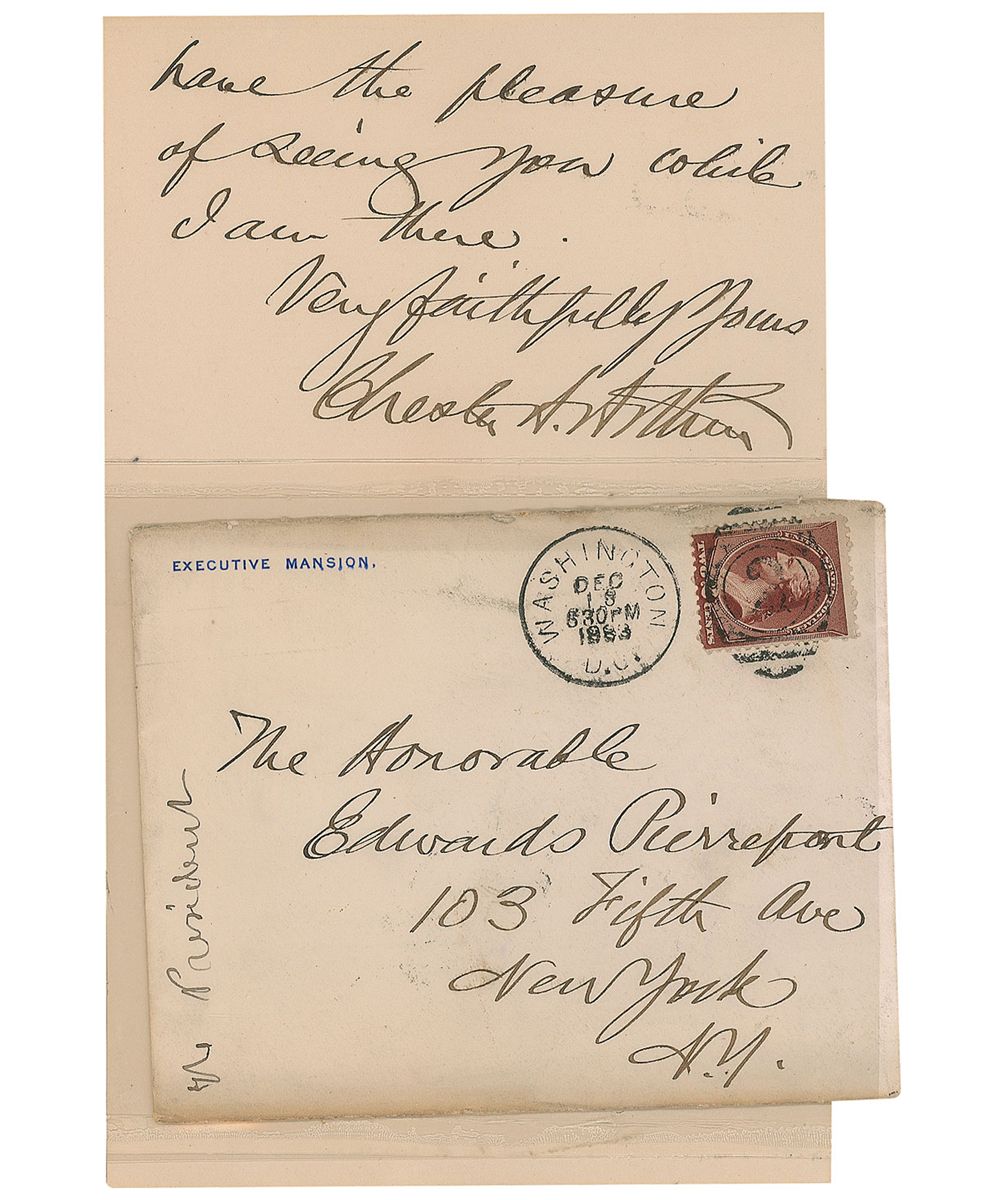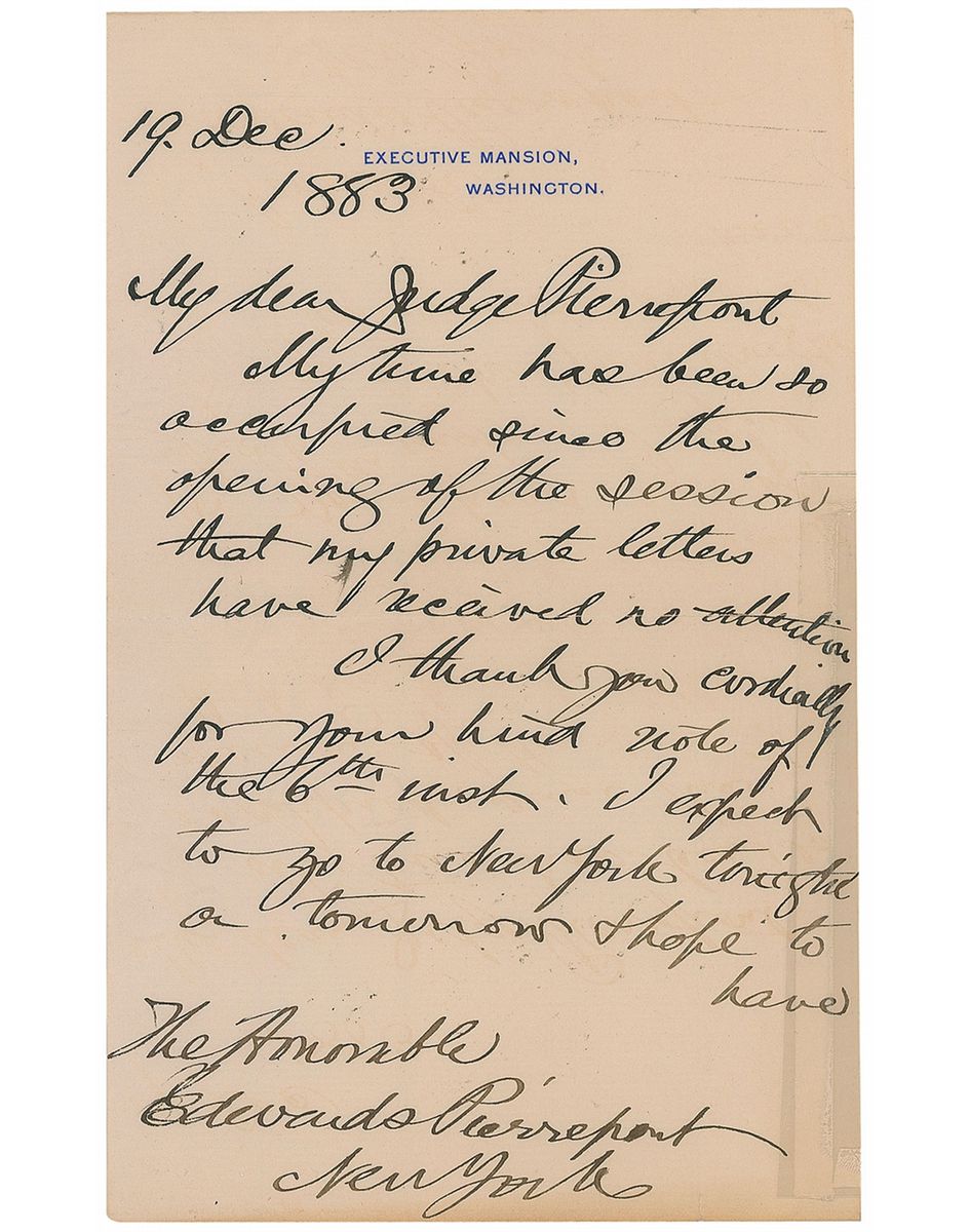Scarce ALS as president, two pages on two adjoining sheets, 5 x 8, Executive Mansion letterhead, December 19, 1883. Letter to Judge Edwards Pierrepont. In full: “My time has been so occupied since the opening of the session that my private letters have received no attention. I thank you cordially for your kind note of the 6th inst. I expect to go to New York tonight or tomorrow & hope to have have [sic] the pleasure of seeing you while I am there.” The letter has been removably archivally sleeved in acid free Mylar. In fine condition, with a complete separation to hinge. Accompanied by the original mailing envelope and two unsigned engravings.