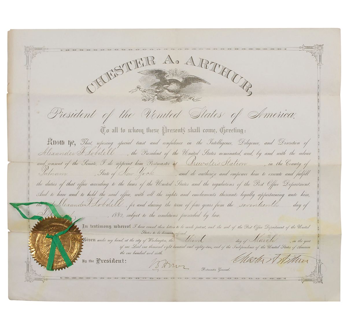 Partly-printed DS as president, one page, 17 x 14, March 3, 1882. President Arthur appoints Alexander F. Lobdell as “Postmaster of Brewster’s Station, in the County of Putnam, State of New York.” Signed at the conclusion by Arthur and countersigned by Postmaster General Timothy O. Howe. Post Office Department seal and ribbons affixed to lower left remain fully intact. In very good condition, with small edge separations to intersecting folds and some irregular toning from seal’s ribbons to the signature area.