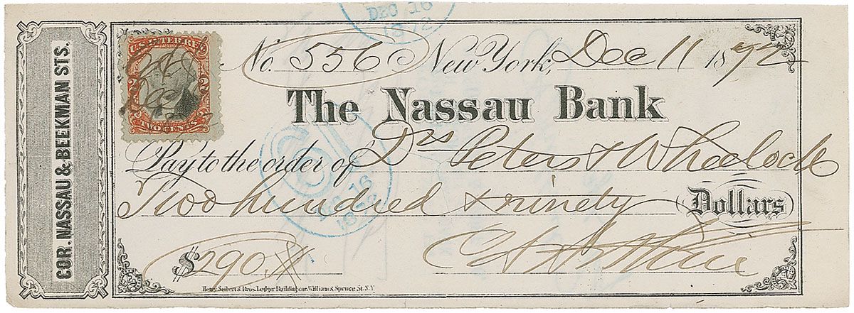 Business check, 7.75 x 2.75, filled out and signed by Arthur, “C. A. Arthur,” payable to Drs. Peters & Wheelock for $290, December 11, 1872. A two-cent revenue stamp is affixed to the upper left, initialed and dated by Arthur, “C. A. A., Dec 11 1872.” In fine condition, with expected bank stamps, notations, and cancellation cuts to the payee area (none affecting the crisp, clean signature). At the time, Arthur was about to see his one-year anniversary as collector of the Port of New York, having been appointed to the position by President Grant on November 20, 1871, and confirmed by the Senate on December 12 of that year.