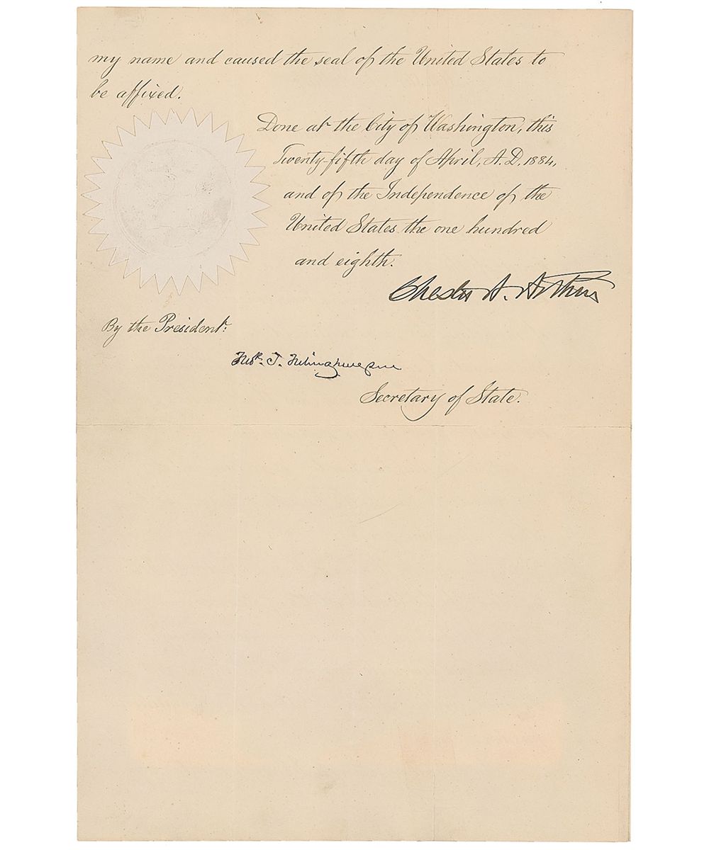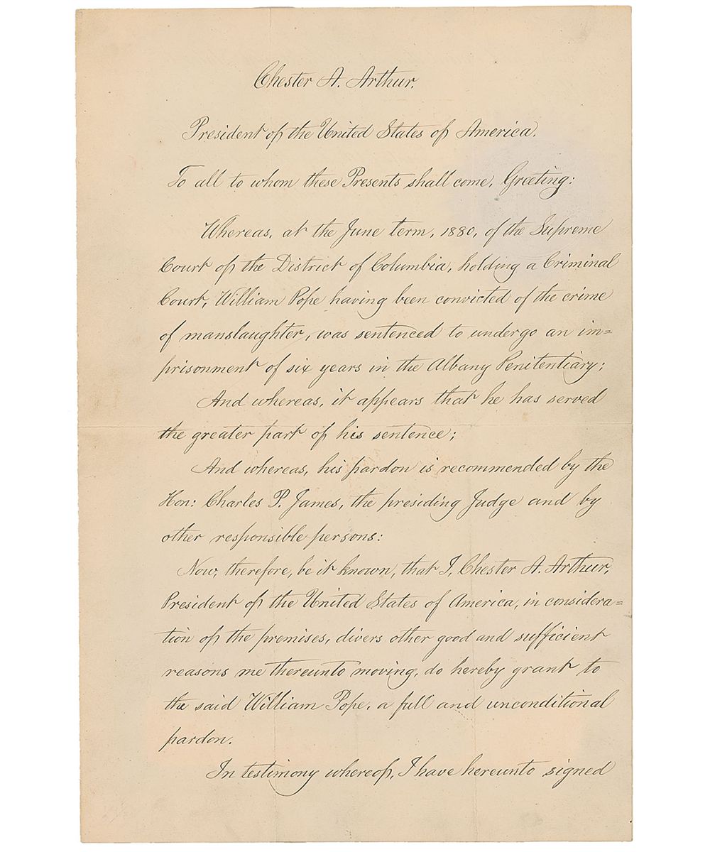 Rare manuscript DS as president, one page both sides, 10.25 x 15.5, April 25, 1884. In part: “William Pope having been convicted of the crime of manslaughter, was sentenced to undergo an imprisonment of six years…it appears that he has served the greater part of his sentence; And whereas, his pardon is recommended by the Hon: Charles P. James, the presiding Judge…therefore, be it known, that I Chester A. Arthur, President of the United States of America…do hereby grant to the said William Pope, a full and unconditional pardon.” Boldly signed at the conclusion by Arthur and countersigned by Secretary of State Frederick T. Frelinghuysen. The white presidential seal affixed beside Arthur’s signature remains extremely crisp and fully intact. Intersecting folds (one vertical fold passing through a single letter of the signature) and a tape repair to one edge separation, otherwise fine condition. This beautifully penned document is the very first pardon by Arthur we have ever offered.
