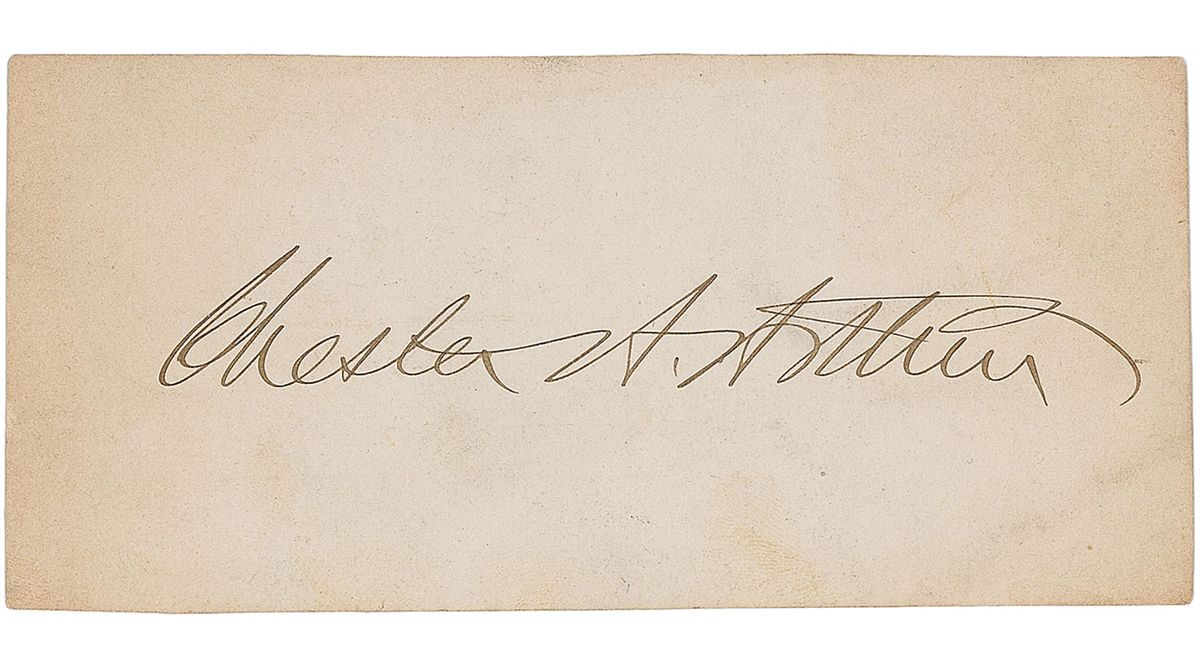 Crisp ink signature, “Chester A. Arthur,” on an off-white 5.25 x 2.5 card. In fine condition, with moderate toning to edges.