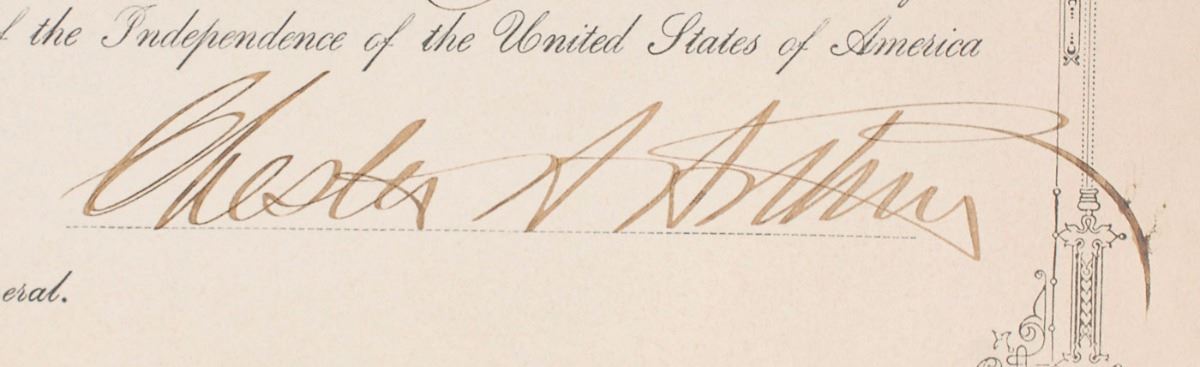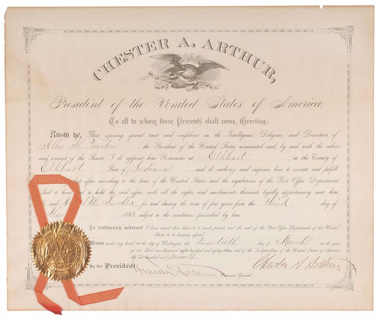 Partly-printed DS as president, one page, 17 x 14, March 20, 1883. President Arthur appoints Alba M. Tucker as “Postmaster at Elkhart, in the County of Elkhart, State of Indiana.” Signed at the conclusion by President Arthur and countersigned by Postmaster General ad interim Frank Hatton. The gold foil seal and ribbon affixed to the lower left remain fully intact. Intersecting folds and light toning, otherwise fine condition.