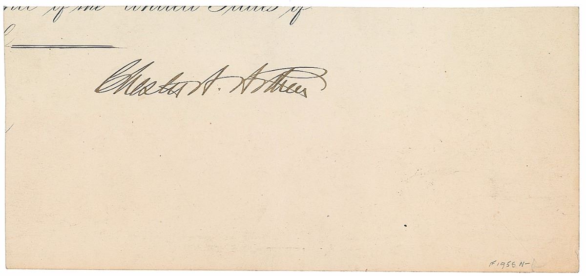 Crisp ink signature, “Chester A. Arthur,” on an off-white 8.5 x 4 slip clipped from a larger document. In fine condition.
