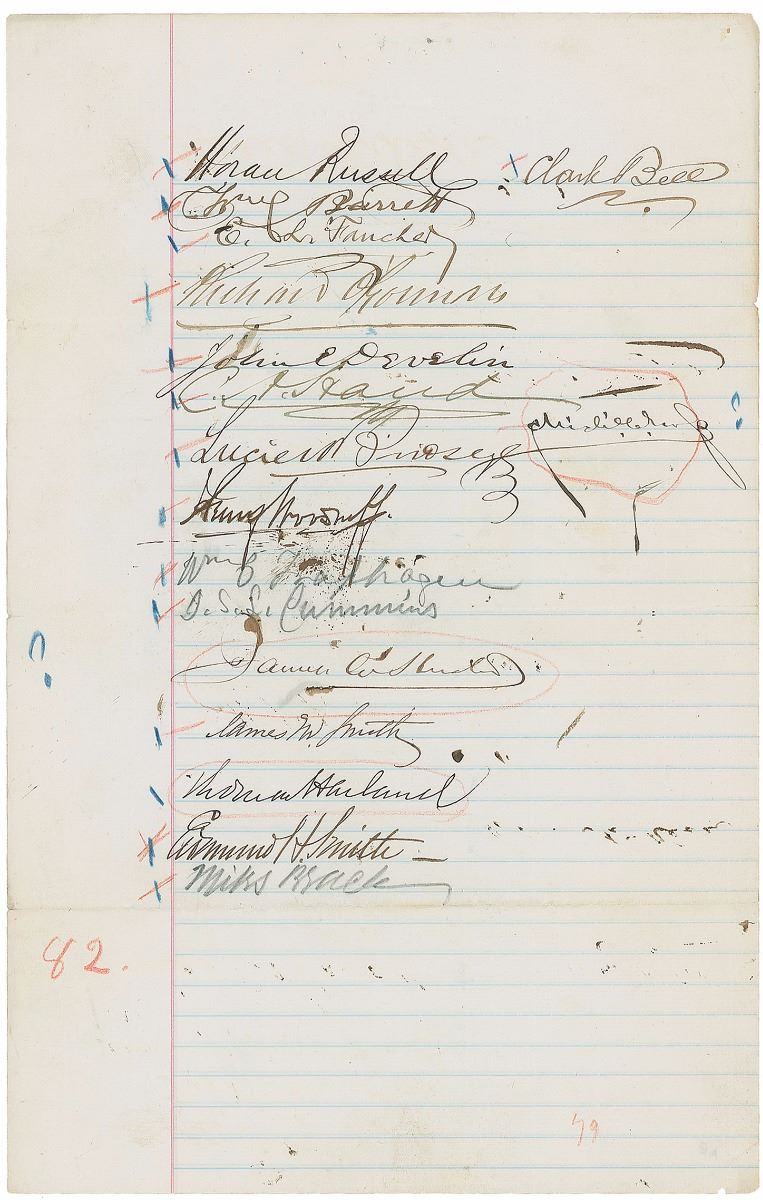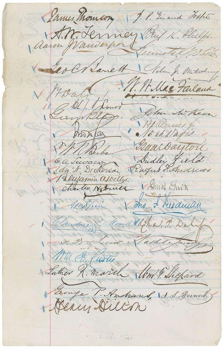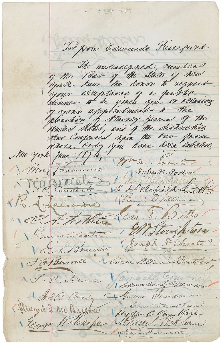 LS signed “C. A. Arthur,” three pages on two sheets, 8.25 x 13, June 1875. Letter to Attorney General Edwards Pierrepont inviting him to a dinner to be held in his honor, signed at the conclusion by over eighty members of the New York Bar Association. In part: “The undersigned…request your acceptance of a public dinner to be given you on occasion of your appointment to the position of Attorney General of the United States.” Arthur signs in the first column, and other notable signers include: Judge John R. Brady, who would swear Arthur in as president upon the death of James A. Garfield; John K. Porter, a prosecutor in the trial of Garfield assassin Charles Guiteau; William M. Evarts, former Chief Counsel for Andrew Johnson at his impeachment trial and future secretary of state; E. C. Benedict, a prominent banker and yachtsman; George H. Sharpe, a Union general and diplomat who investigated the assassination of Abraham Lincoln; diplomat Edwin W. Stoughton; and diplomat Joseph H. Choate. All of these notable figures have signed on the first page. Overall wear, creases, and soiling, otherwise fine condition. A unique piece rife with intriguing associations.