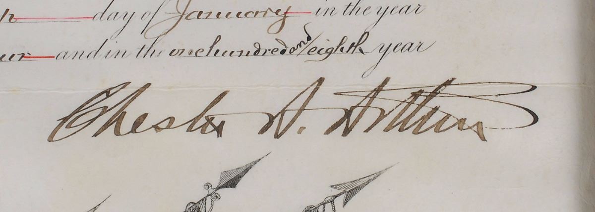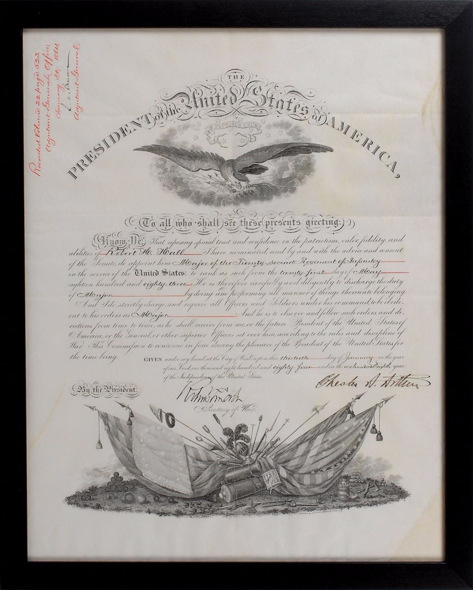 Partly-printed DS as president, one page, 15 x 19, January 30, 1884. President Arthur appoints Robert H. Hall as “Major of the Twenty-second Regiment of Infantry in the service of the United States.” Boldly signed at the conclusion by President Arthur and countersigned by Secretary of War Robert Todd Lincoln. Framed to an overall size of 17 x 21. Intersecting storage folds (one horizontal fold touching the upper tips of the signature), scattered soiling, and a restored lower right corner, otherwise fine condition.