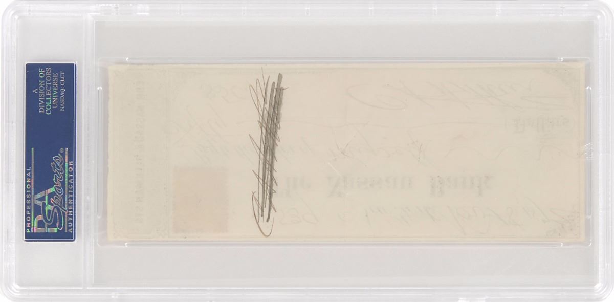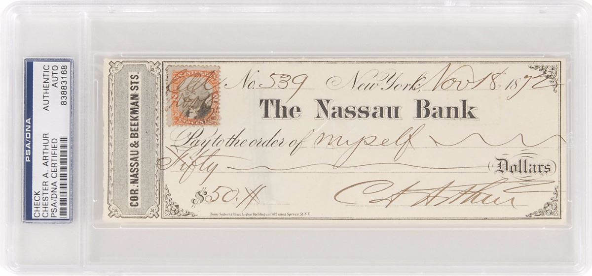 Bank check, 7.5 x 2.75, filled out and signed by Arthur, “C. A. Arthur,” payable to “myself” for $50, November 18, 1872. Also endorsed on the reverse by Arthur, but the signature has been struck through. Encapsulated in a plastic PSA/DNA authentication holder. In fine condition, with a central vertical fold, and light show through from his crossed-out endorsement signature.