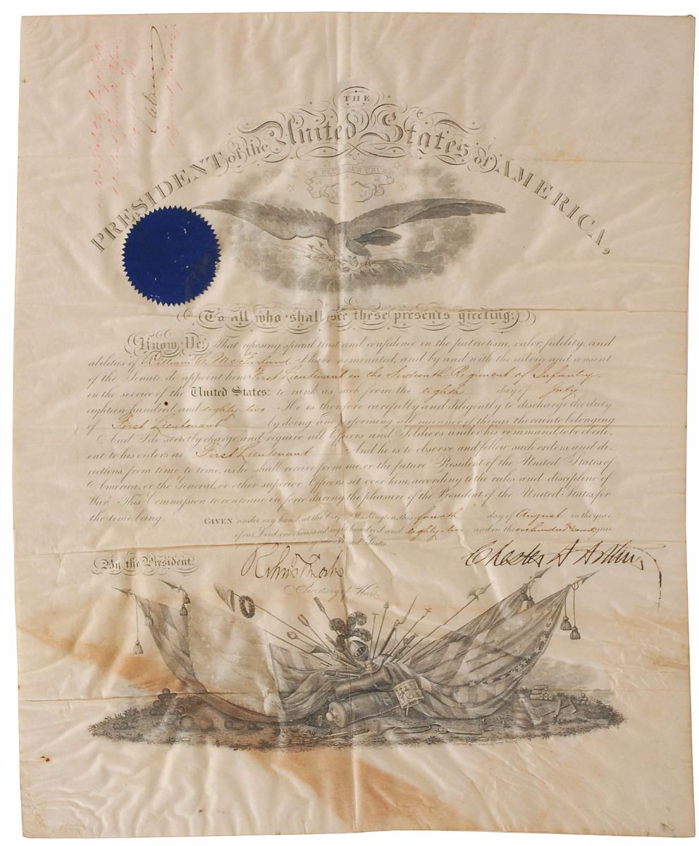 Partly-printed vellum DS as president, one page, 15.5 x 18.75, August 4, 1882. President Arthur appoints William C. McFarland as a “First Lieutenant in the Sixteenth Regiment of Infantry.” Boldly signed at the conclusion by Arthur and countersigned by Secretary of War Robert Todd Lincoln. Retains the blue seal affixed to the upper left. In very good condition, with moderately heavy overall wrinkling, and areas of staining, heaviest at the bottom.