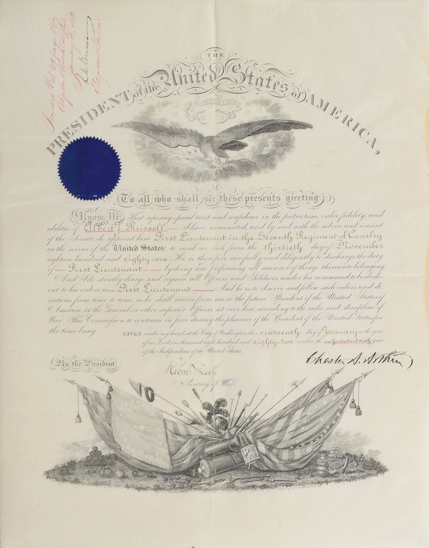 Very crisp partly-printed vellum DS as president, one page, 15.75 x 19.75, January 16, 1882. President Arthur appoints Albert J. Russell as "First Lieutenant in the Seventh Regiment of Cavalry in the service of the United States." Boldly signed at the conclusion by Arthur, and countersigned by Secretary of War Robert Todd Lincoln. Dark blue War Office seal remains affixed to upper left. In fine condition.