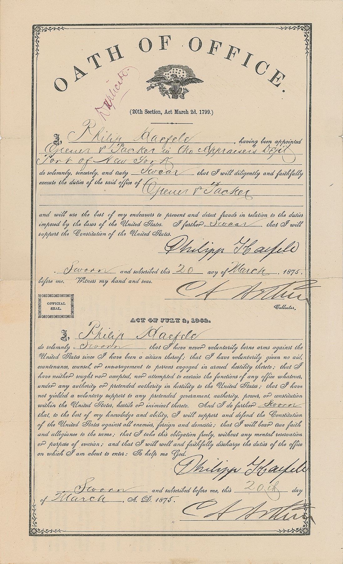 Partly-printed DS, signed “C. A. Arthur,” one page, 8.5 x 14, March 20, 1875. Port of New York Oath of Office by which Philip Haefele assumes the position of "Opener & Packer," swearing that he has "never voluntarily borne arms against the United States…given no aid, countenance, counsel or encouragement to persons engaged in armed hostility…not yielded a voluntary support to any pretended government…I will support and defend the Constitution of the United States against all enemies, foreign and domestic." Signed twice by Arthur as collector of the Port of New York, and also signed twice by Haefele. In fine condition, with small edge separations at folds.