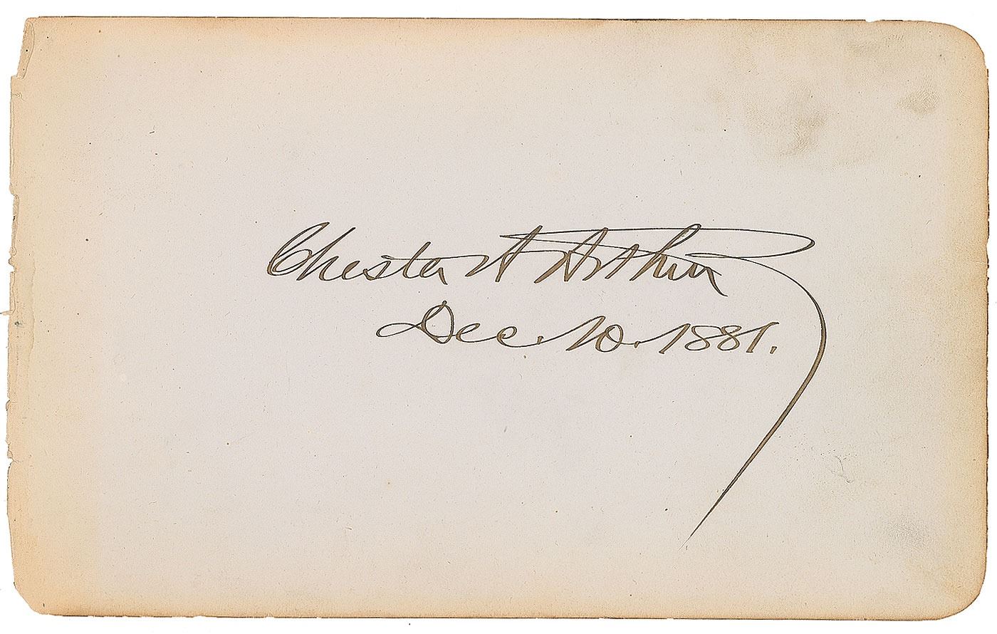 Ink signature as president, "Chester A. Arthur, Dec. 10, 1881,” on an off-white 7.5 x 4.75 album page. In fine condition, with some scattered light soiling.