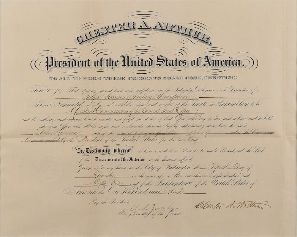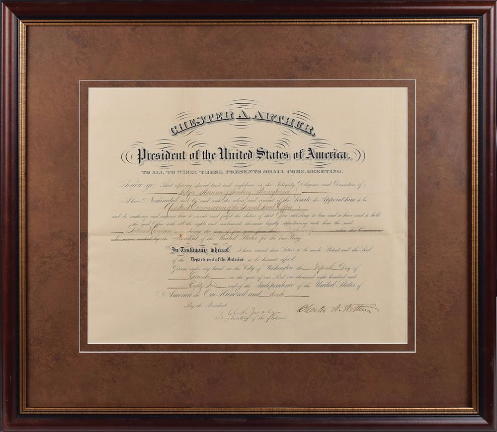 Partly-printed DS as president, one page, 9 x 15.25, December 15, 1884. President Arthur appoints Luther Harrison as "Assistant Commissioner of the General Land Office." Signed at the conclusion by Arthur, and countersigned by Acting Secretary of the Interior M. L. Joslyn. Lower left bears a Department of the Interior blindstamp. Double-matted and framed to an overall size of 29.75 x 26. In fine condition, with intersecting folds.