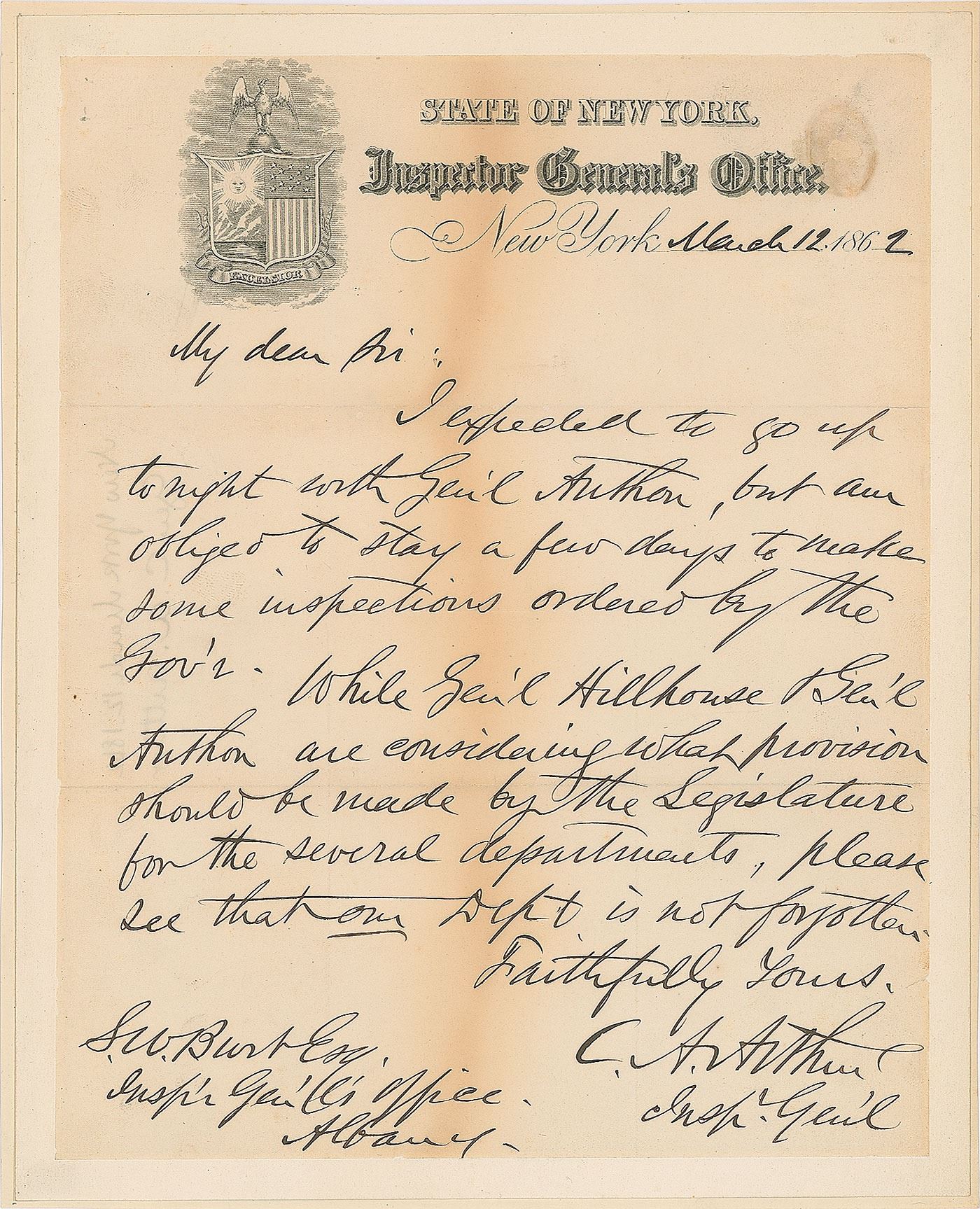 Civil War–dated ALS signed “C. A. Arthur, Insp. Gen'l,” one page, 7.75 x 9.75, State of New York Inspector General's Office letterhead, March 12, 1862. Letter to S. W. Burt at the Inspector General's Office in Albany, in full: "I expected to go up tonight with Gen'l Authon, but am obliged to stay a few days to make some inspections ordered by the Gov'r. While Gen'l Hillhouse & Gen'l Authon are considering what provision should be made by the Legislature for the several departments, please see that our Dept. is not forgotten." Professionally inlaid into a slightly larger sheet, which is tipped to another page. In very good to fine condition, with a vertical strip of toning, and a small stain to the upper right corner.