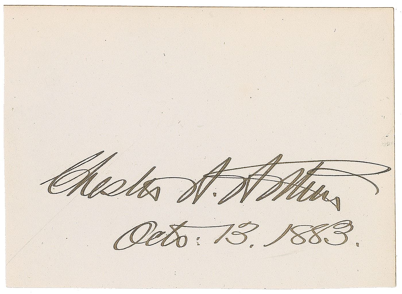Ink signature as president, "Chester A. Arthur, Octo: 13, 1883,” on an off-white 4.5 x 3.25 sheet. In fine condition. On the same date of this signature, Arthur issued an executive order acceding to the request of General William T. Sherman to be relieved from the command of the Army on November 1, 1883.