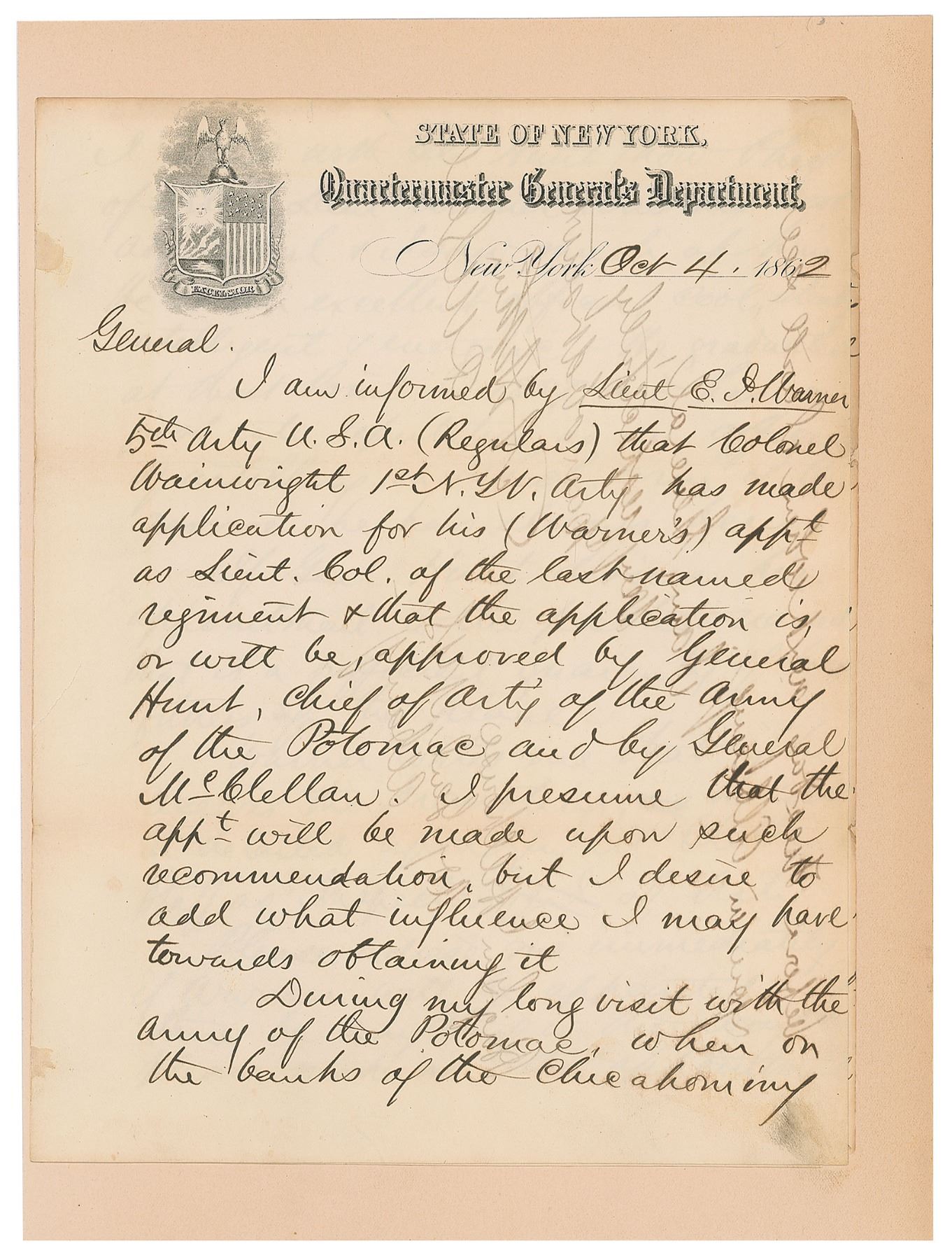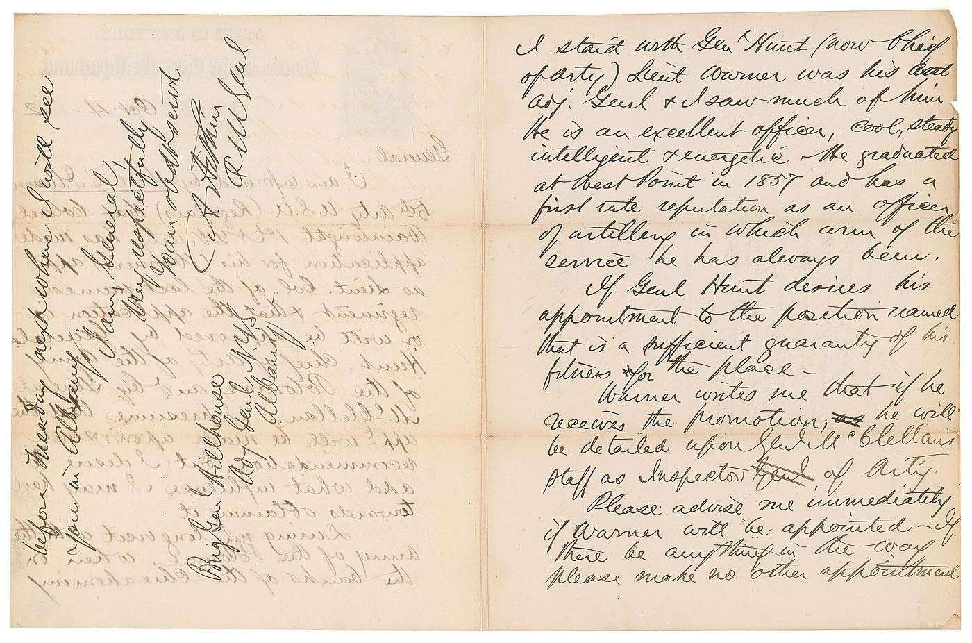 Civil War-dated ALS signed “C. A. Arthur, QM Gen'l,” three pages on two adjoining sheets, 8.5 x 11, Quartermaster General's Department, State of New York letterhead, October 4, 1862. Letter to Brigadier General Thomas Hillhouse in Albany, in full: "I am informed by Lieut. E. J. Warner 5th Arty U.S.A. (Regulars) that Colonel Wainwright 1st N.Y. V. Art'y has made application for his (Warner's) app't as Lieut. Col. of the last named regiment & that the application is, or will be, approved by General Hunt, chief of art'y of the Army of the Potomac and by General McClellan. I presume that the app't will be made upon such recommendation, but I desire to add what influence I may have towards obtaining it. During my long visit with the Army of the Potomac, when on the banks of the Chicahominy I staid with Gen'l Hunt (now Chief of Art'y) Lieut. Warner was his Asst. Adj. Gen'l & I saw much of him. He is an excellent officer, cool, steady, intelligent & energetic. He graduated at West Point in 1857 and has a first rate reputation as an officer of artillery in which arm of the service he has always been. If Gen'l Hunt desires his appointment to the position named that is a sufficient guaranty of his fitness for the place. Warner writes me that if he receives the promotion, he will be detailed upon Gen'l McClellan's staff as Inspector of Art'y. Please advise me immediately if Warner will be appointed—If there be anything in the way please make no other appointment before Tuesday next when I will see you in Albany." The letter is affixed to a slightly larger sheet. In fine condition, with a partial separation to fold.
