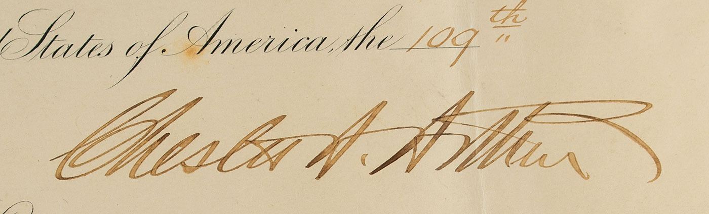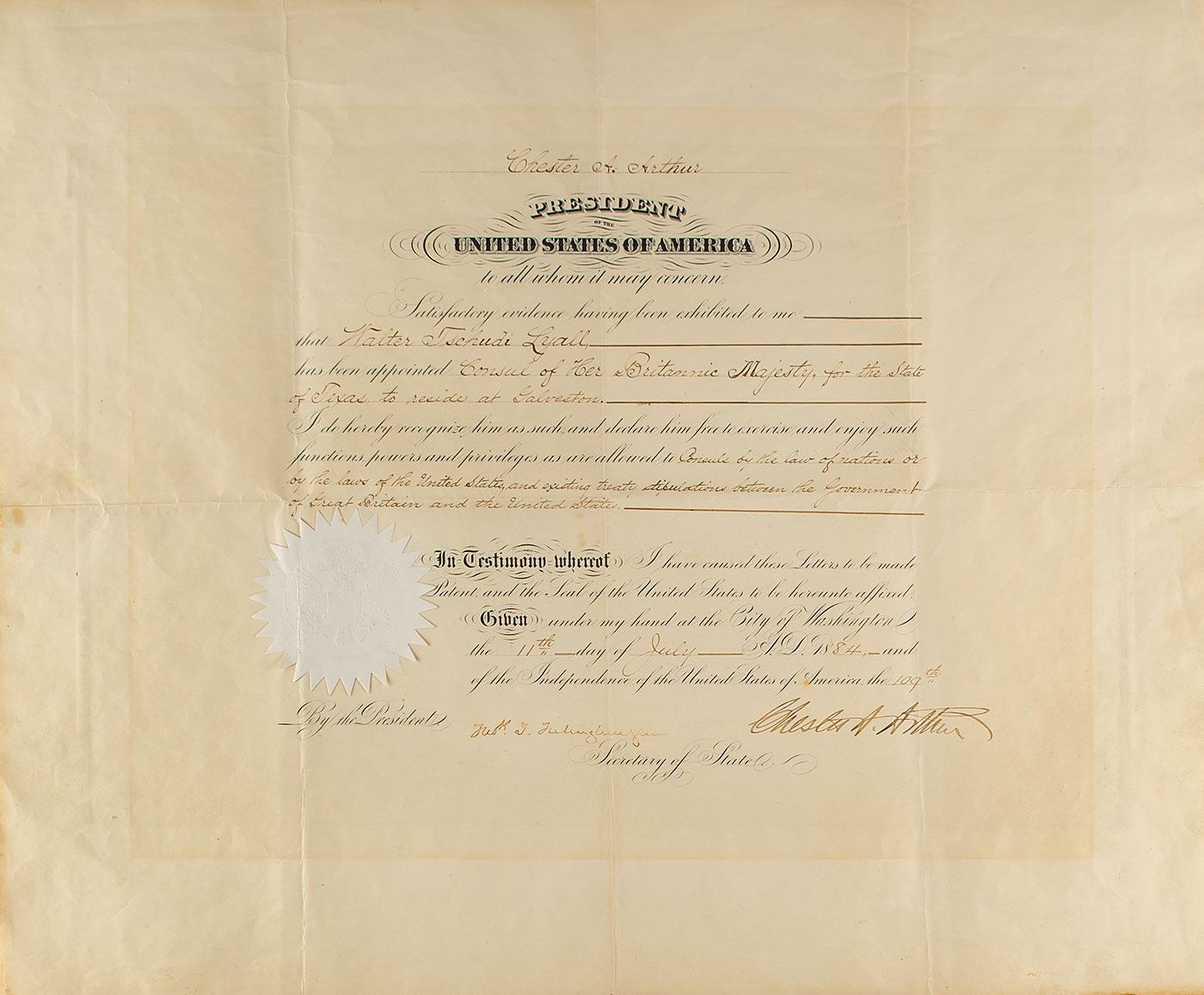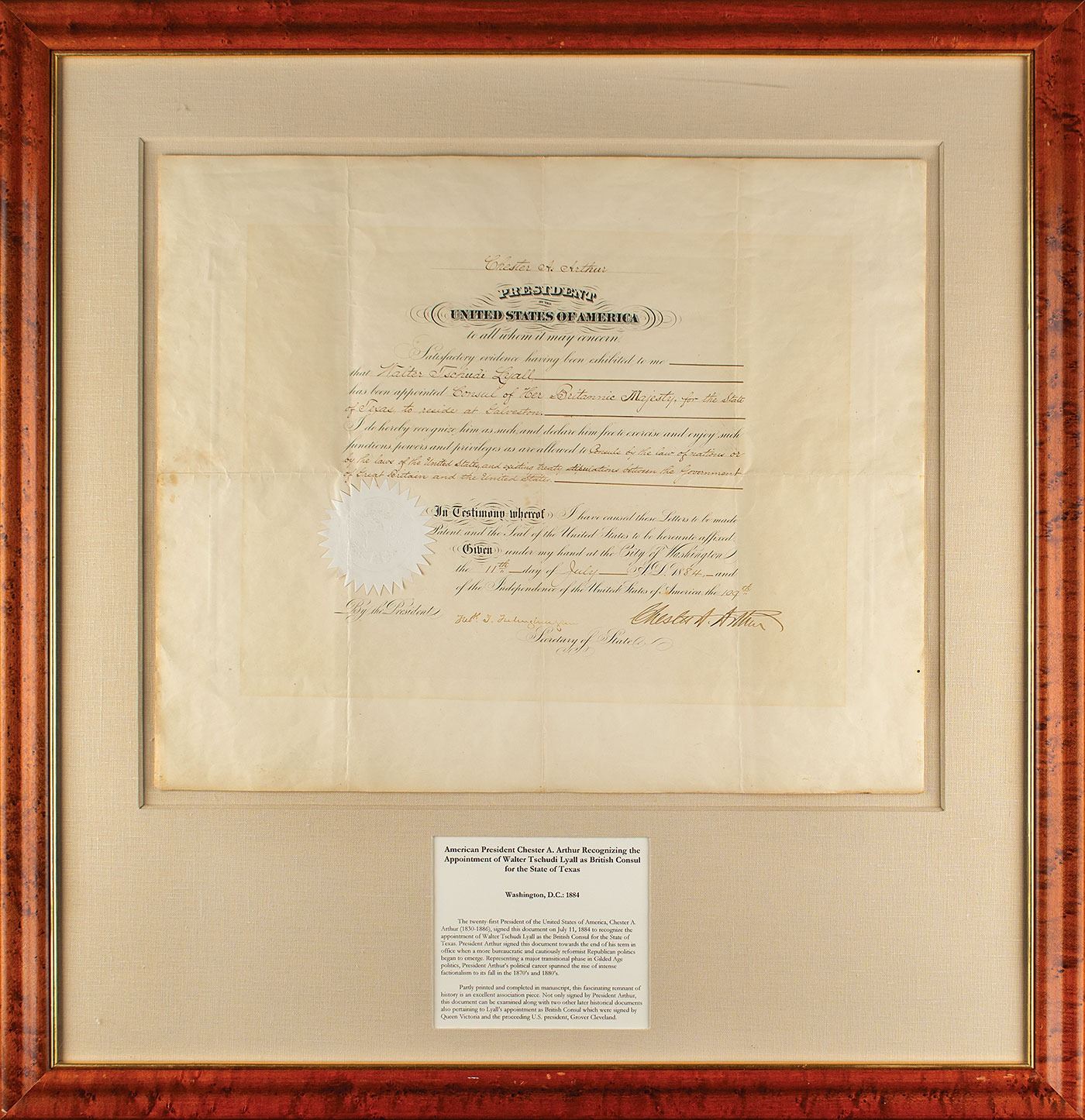 Partly-printed DS as president, one page, 22.75 x 18.75, July 11, 1884. President Arthur officially recognizes the appointment of Walter Tschudi Lyall as "Consul of Her Britannic Majesty, for the State of Texas, to reside at Galveston." Boldly signed at the conclusion by President Arthur and countersigned by Secretary of State Frederick F. Frelinghuysen. The white paper seal affixed to the lower left remains intact. Impressively mounted, matted, and framed to an overall size of 32.5 x 33.25. In very good to fine condition, with intersecting folds, and light toning from prior display.