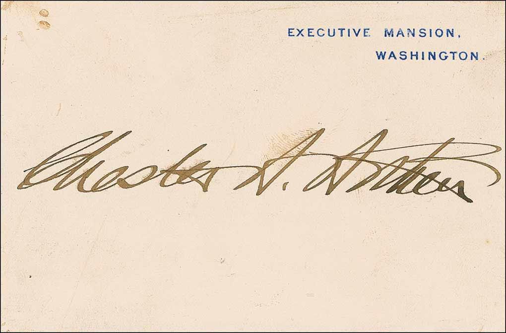 Very scarce signed Executive Mansion card, boldly signed “Chester A. Arthur.” In very good condition, with a couple light brushes to signature, some mild toning, and mounting remnants to reverse.