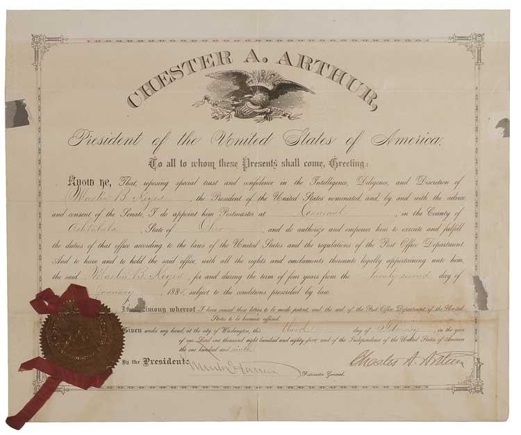 Partly-printed DS as president, one page, 17 x 14, February 3, 1885. President Arthur appoints Martin B. Keyes Postmaster at Conneaut, Ohio. Signed at the bottom by Arthur, and countersigned by Postmaster General Frank Hatton. Several tape remnants, mostly in borders, light overall toning, with a couple heavier lines at bottom, a few partial separations along intersecting storage folds, and a few small spots of paper loss at junction of folds, otherwise good to very good condition. The gold foil seal is worn, but intact, with both red ribbons still present. Pre-certified John Reznikoff/PSA/DNA and RRAuction COA.