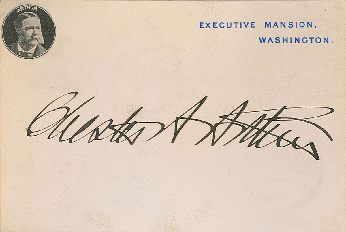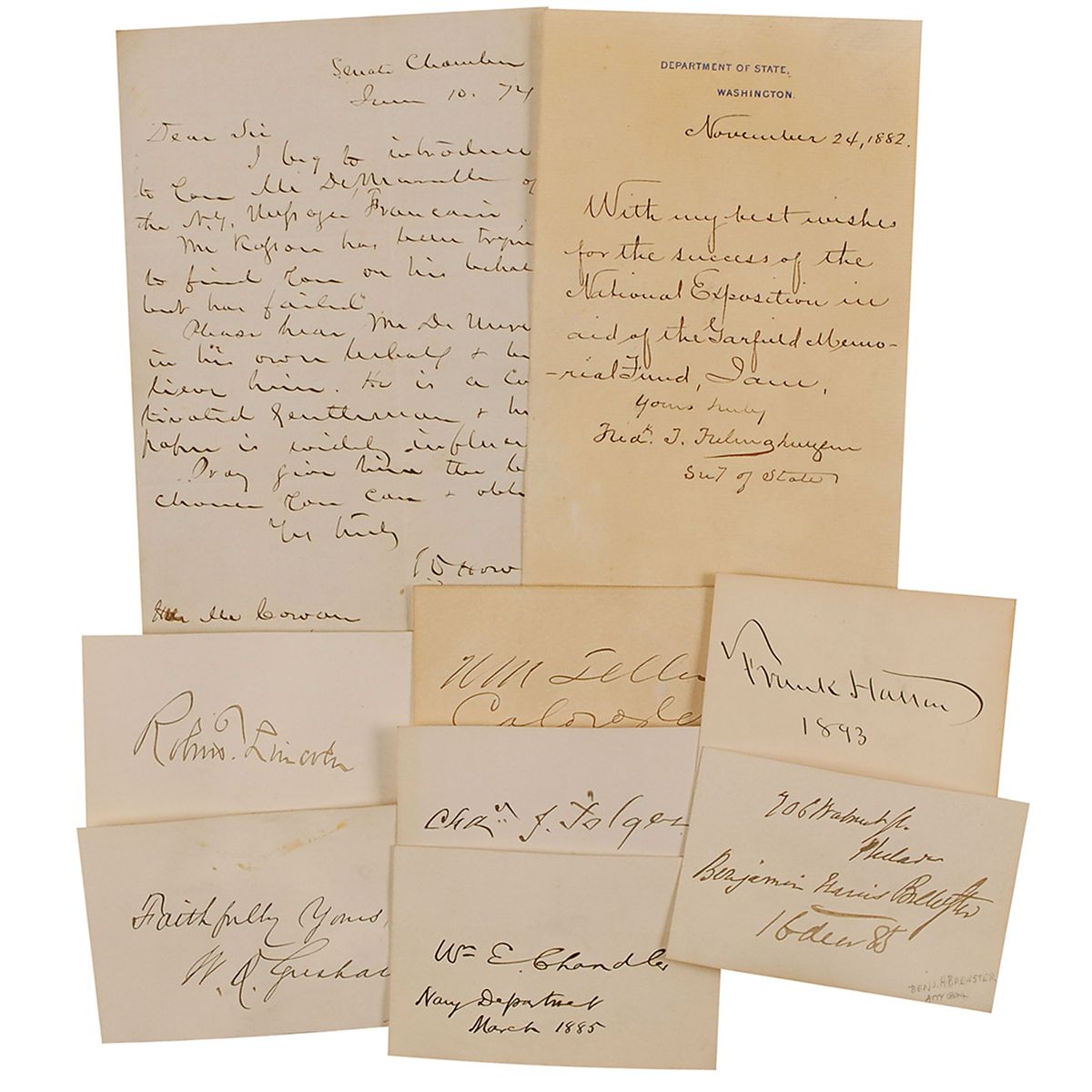 Uncommon Executive Mansion card, 4 x 2.75, boldly signed in black ink, “Chester A. Arthur.” Card bears a small clipped portrait of Arthur affixed to the upper left corner. In very good condition, with moderate rippling, light toning and soiling, and mounting remnants to the reverse. Accompanied by nine letters and cards, each signed by a member of his cabinet. Signers are: Robert Todd Lincoln, Henry M. Teller, Walter Q. Gresham, Frederick Theodore Frelinghuysen, Benjamin H. Brewster, Frank Hatton, William E. Chandler, Charles J. Folger, and Timothy O. Howe. Various scattered toning, soiling, and light rippling, otherwise overall fine condition.