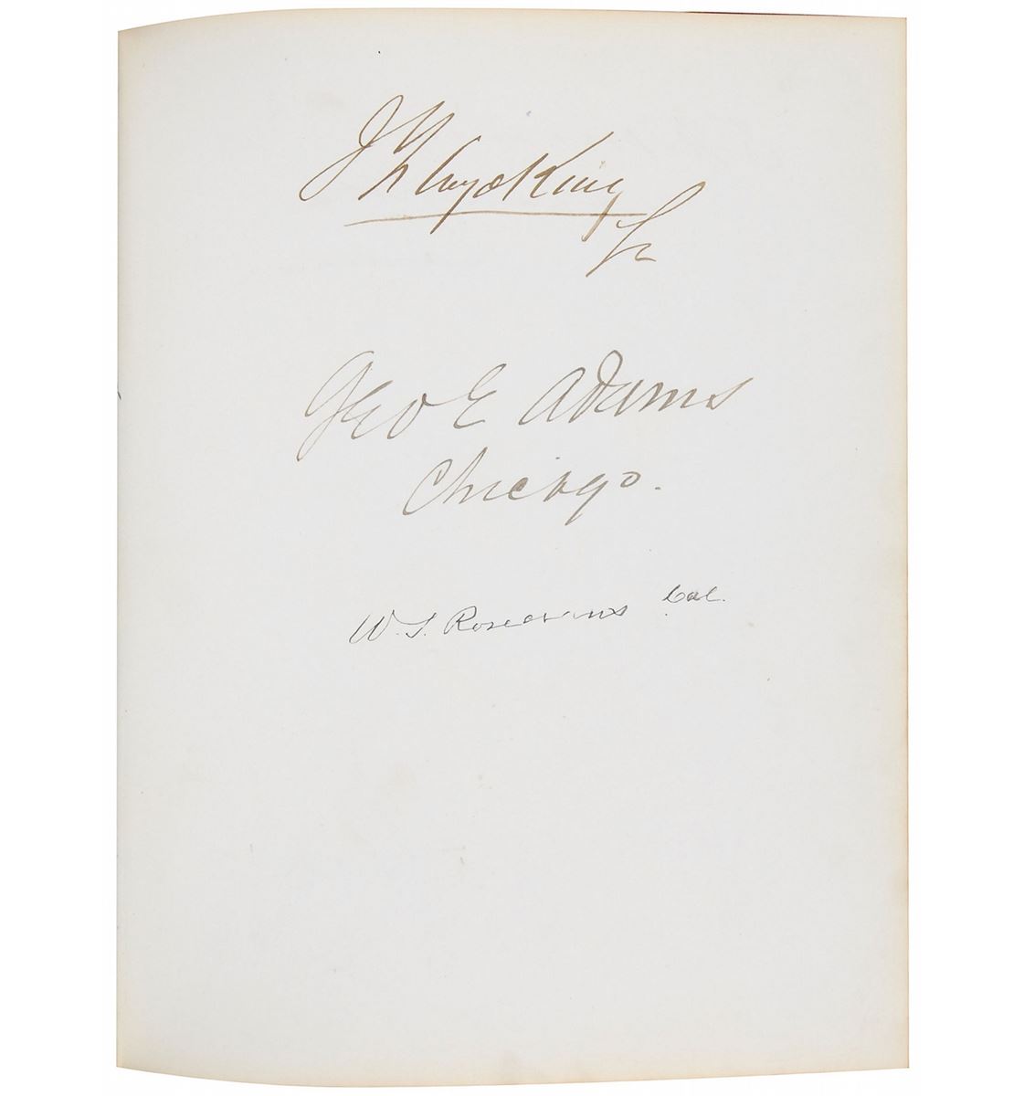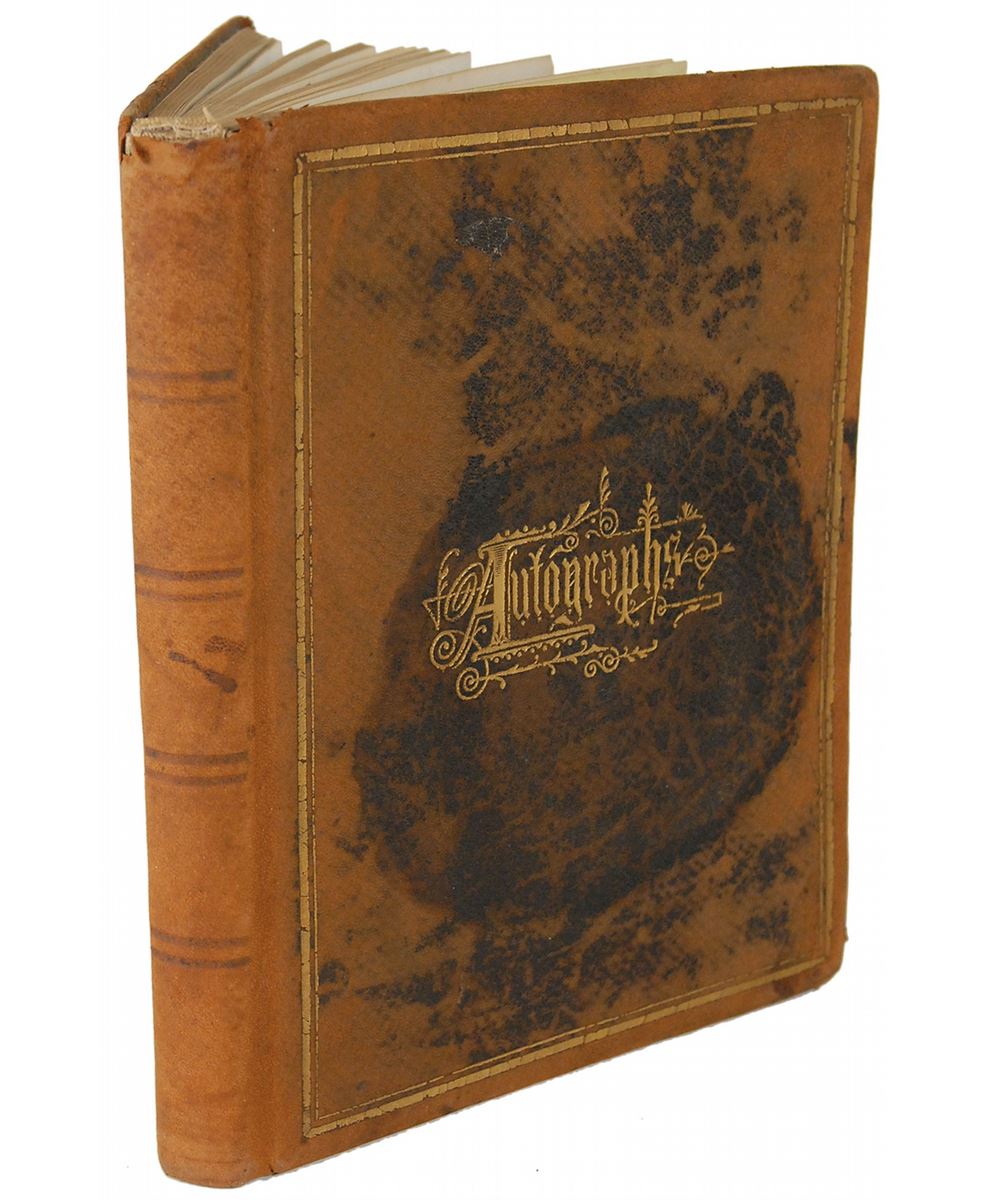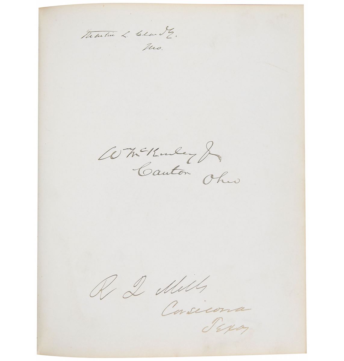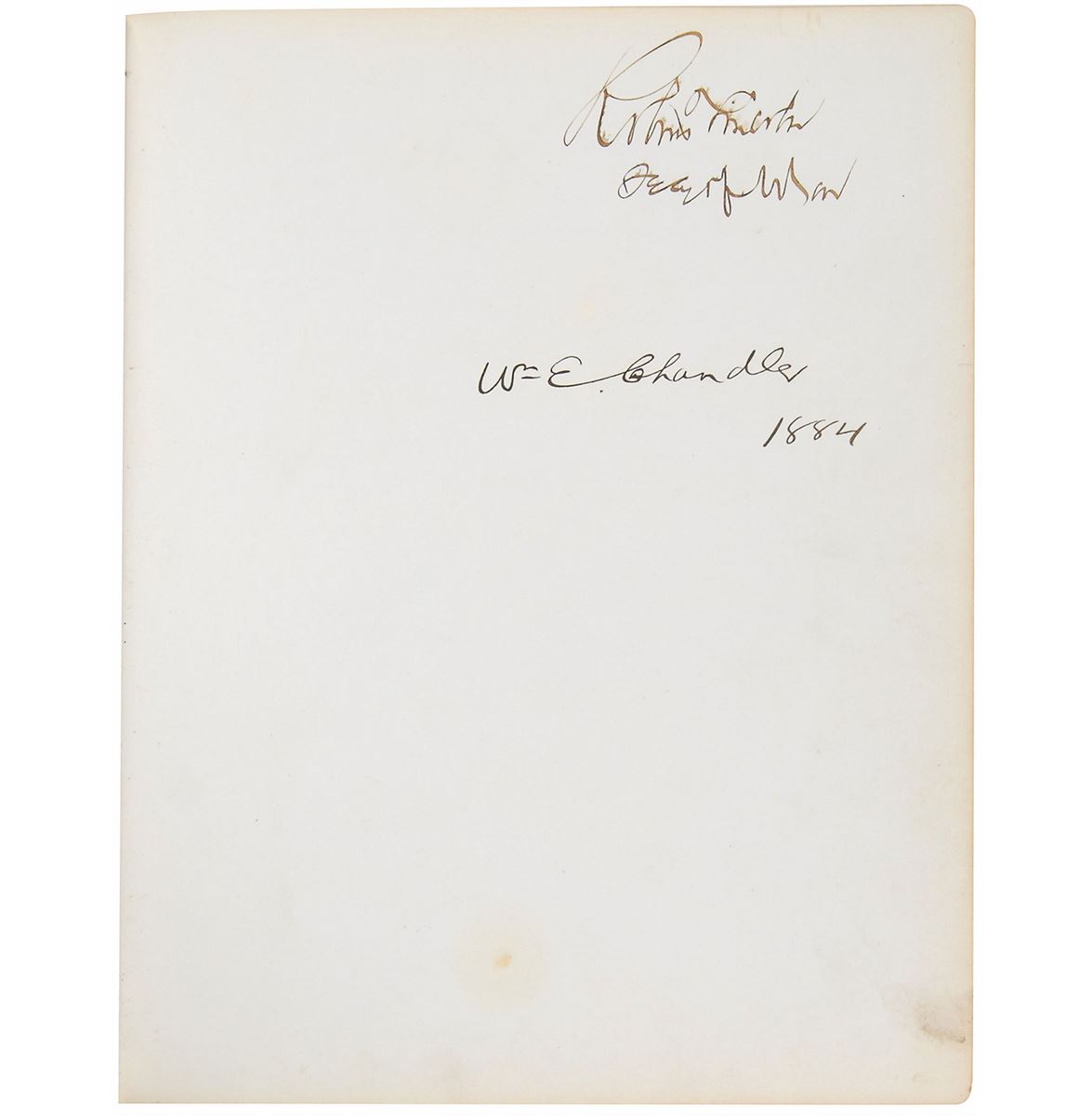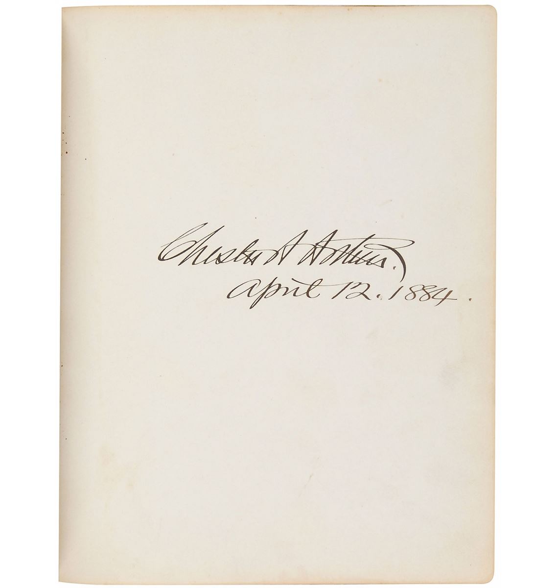 Hardcover leatherbound autograph album, 7.5 x 9.25, signed inside, as president, “Chester A. Arthur, April 12, 1884,” and also signed by seven members of his cabinet: “Fredck. T. Frelinghuysen" (Secretary of State), "W. Q. Grisham" and "Chas. J. Folger" (Secretaries of the Treasury), "Benjamin Harris Brewster" (Attorney General), "Robert T. Lincoln" (Secretary of War), "Wm. E. Chandler" (Secretary of the Navy), and "H. M. Teller" (Secretary of the Interior). Album is additionally signed by more than 340 members of the 48th US Congress (almost all back-to-back), including future president William McKinley, and former Union general William Rosecrans. Accompanied by a 4.5 x 3.5 card presenting the album to California Governor James Herbert Budd, with a small sprig of flowers affixed to the card with a small blue ribbon. Some scattered light toning and soiling to pages, reinforcement to hinges, and moderate wear to covers, otherwise fine condition. Budd served a single term in Congress from 1883–1885, and ten years later was elected governor of California after a bitter campaign, edging out Morris Estee by only 1200 votes. An impressive collection of signatures obtained near the end of Arthur’s term, containing most of his cabinet at the time, as well as a majority of senators and representatives, including a future president. Previously sold by Sotheby’s, June 2014.