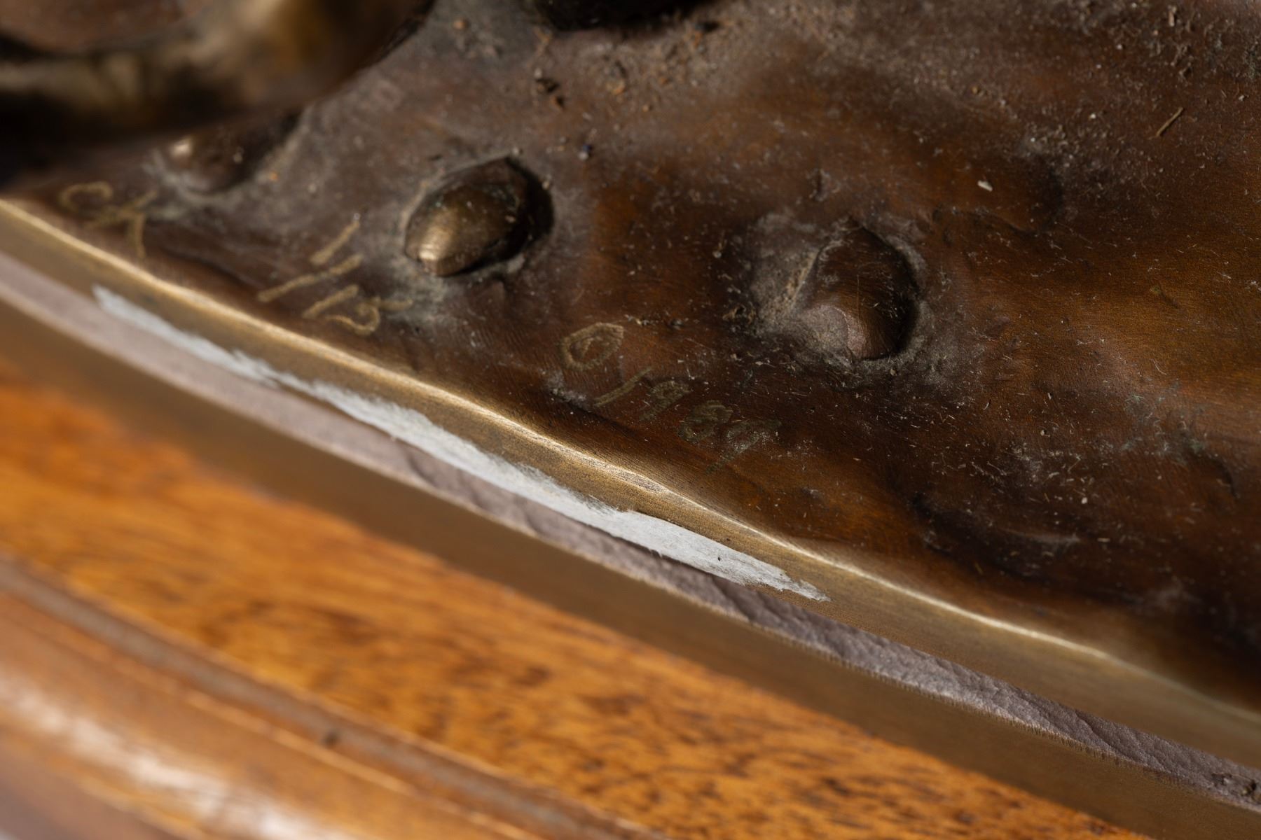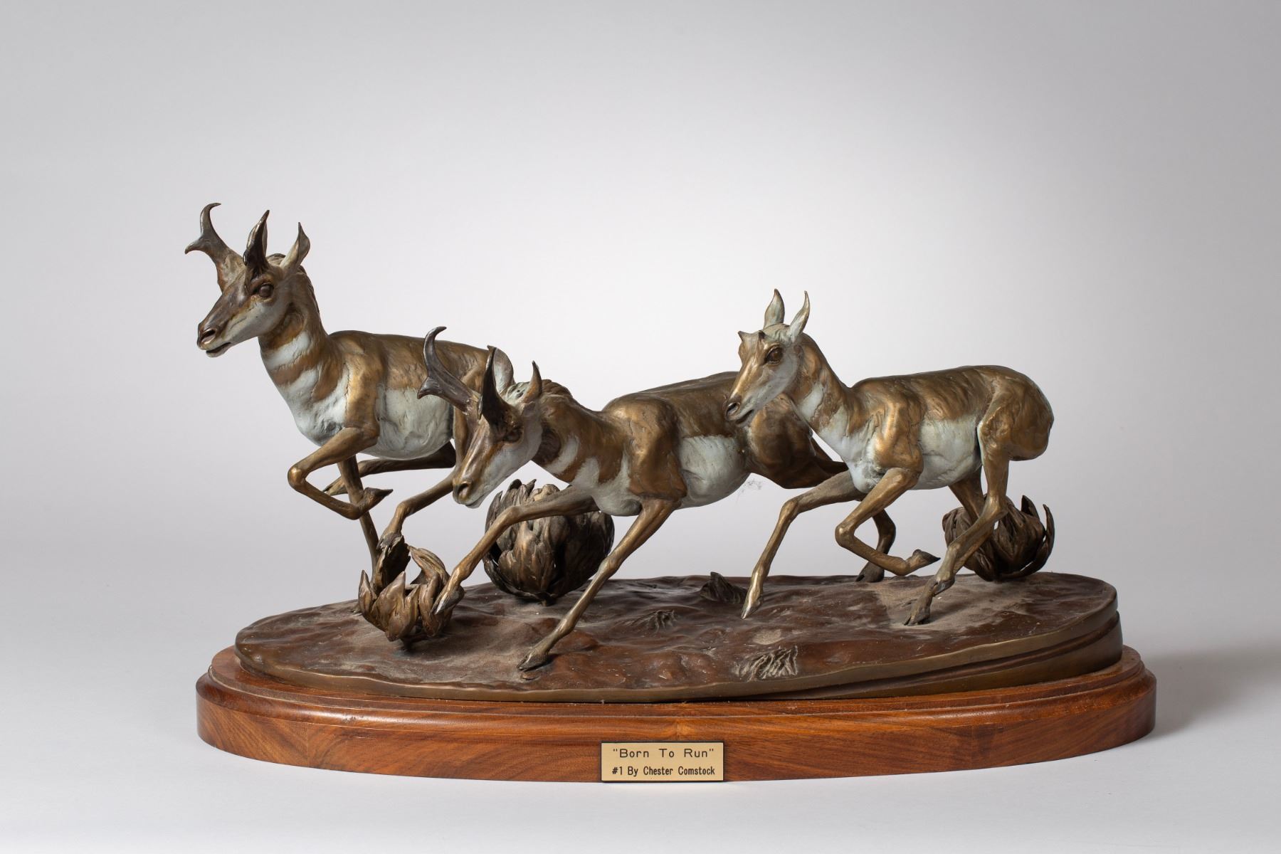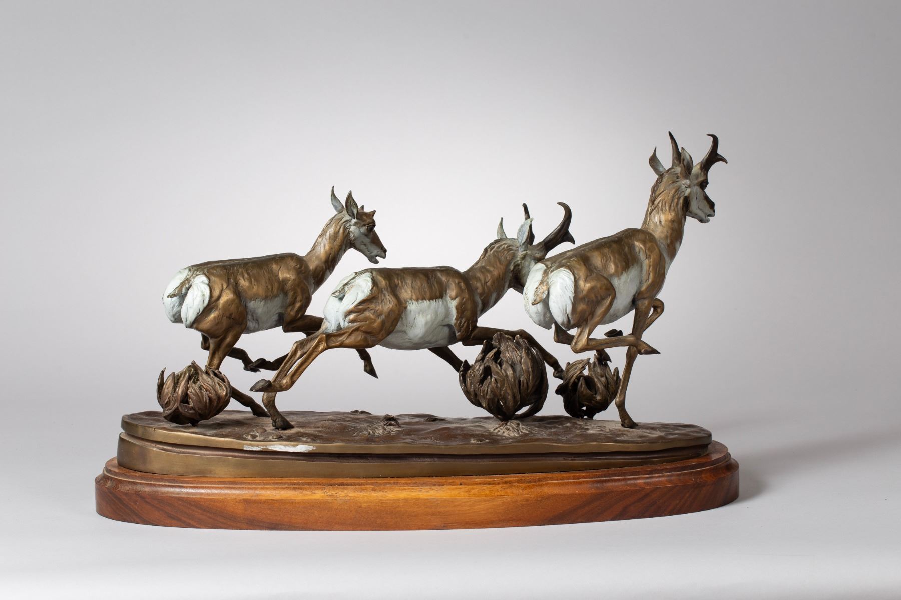 Sculpture of Running Antelope in bronze with metals chosen for color and workability with delicate translucent patinas added. Delicate, translucent patinas have been applied to the surface, enhancing the natural beauty of the bronze and contributing subtle variations in tone. This attention to finish brings out the lifelike qualities of the piece. The sculpture is set within a carefully portrayed natural environment, providing a sense of scale and capturing an isolated moment in nature. This context adds to realism and immerses the viewer in the scene. This work is 1 out of 15, and was completed in 1987.