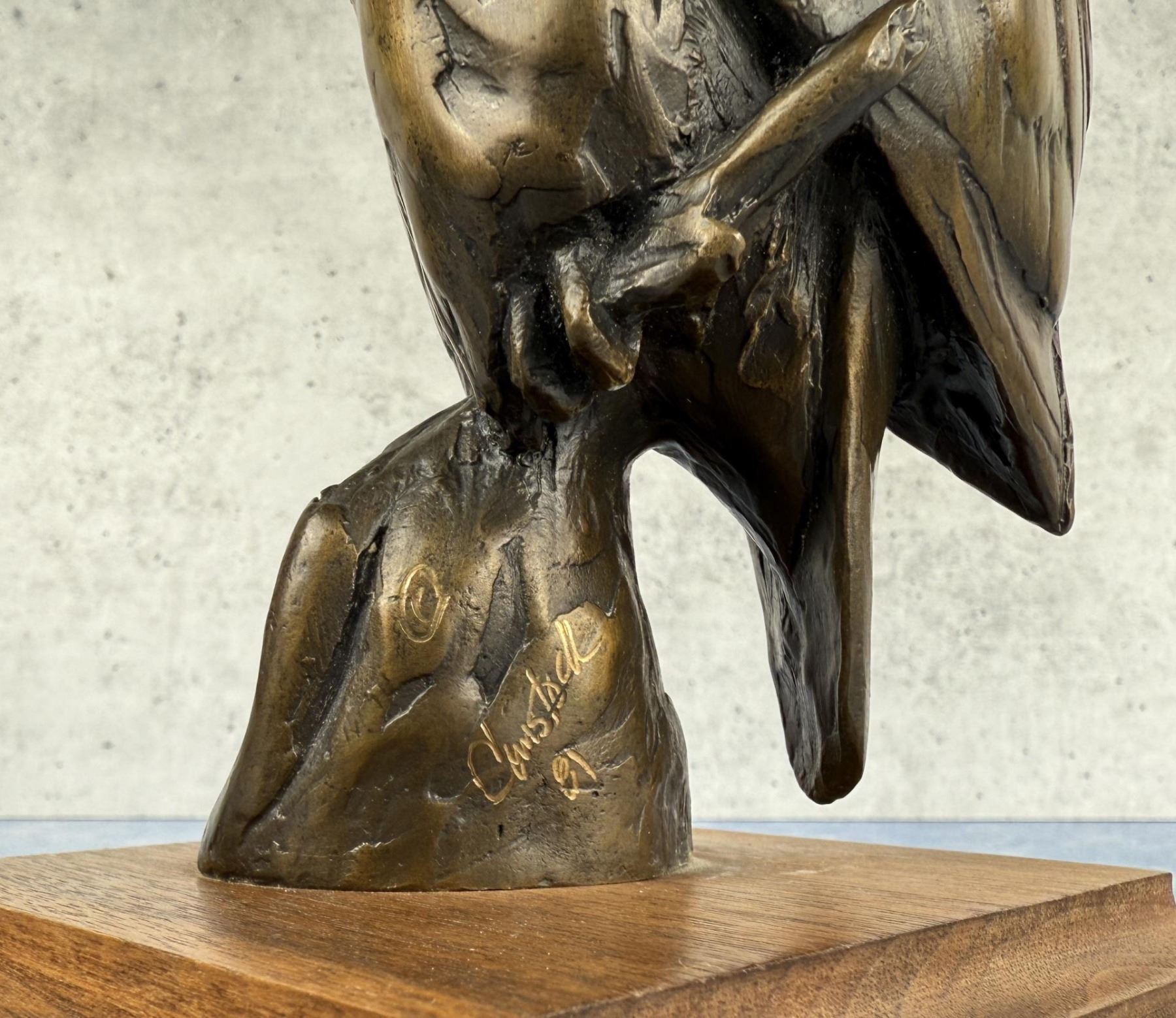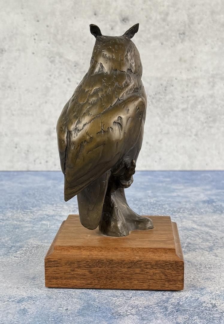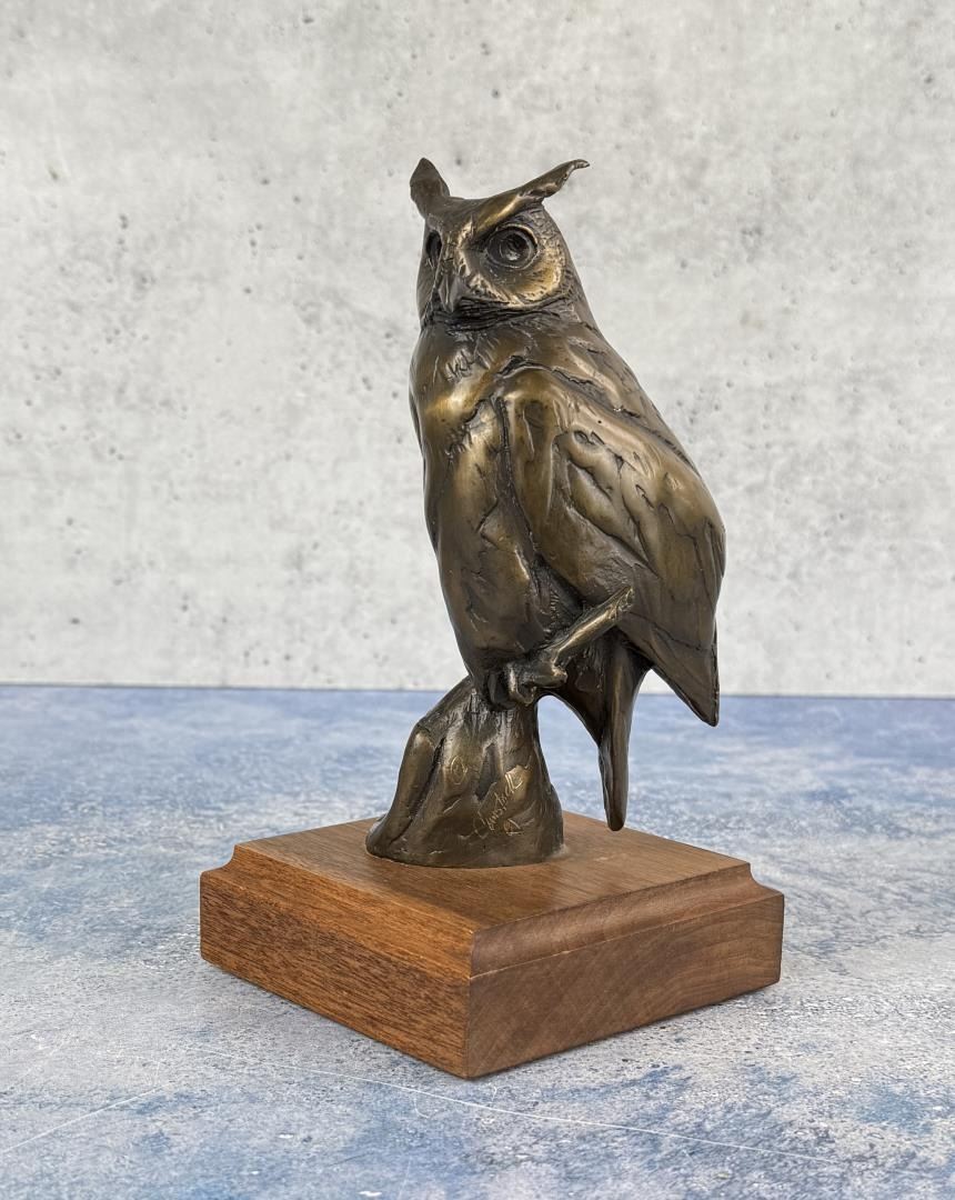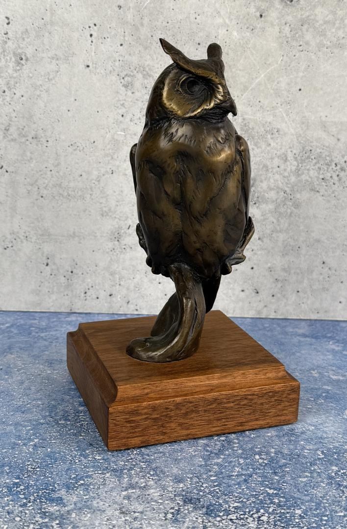 8" by 4 1/4" by 4 1/4". Title is The Great Horned Owl. Chester Comstock (20/21st century) is active/lives in Colorado. Chester Comstock is known for Sculpture. The work of Chester Comstock is born of two equal dedications -- a dedication to aesthetics of art and a dedication to the science of fine casting. Even on close examination his sculptured animal seems real. It is even portrayed with a bit of its natural environment to offer a sense of scale in an isolated moment of nature. In order to achieve this natural delicacy & realism in such materials as bronze and heavy metal alloys, the artist requires a keen eye, a deep appreciation of nature and a thorough understanding of casting technology and metallurgy. Chester's work embodies these vital prerequisites. It's uncanny realism is proof enough. Comstock chooses metal for color as well as workability. Delicate translucent patinas are added for even greater realism. Details are checked with Comstock finishing every casting personally. The results delight the eye and spark the imagination. Born in Billings, Montana, Chester Comstock now lives in Fort Collins, Colorado. Though his interest in art began with early contacts with Colorado artists Hal Shelton and Ralph Tice, Comstock's serious work began in the San Francisco Bay area where he worked & studied from 1964 to 1968. He also worked as a foundryman at the San Francisco Foundry and at the San Francisco Art Institute with Steve Distabler during this period. He went on to receive a commission in the Army Corps of Engineers, and additional study at Stanford University in Material Sciences and Industrial Engineering. Each experience contributed to his unique blend of discipline, technical knowledge and artistic skill. Chester now enjoys the ability to explore the boundaries and limitations of his media, making creative applications and considerations to the various stages of the production process.