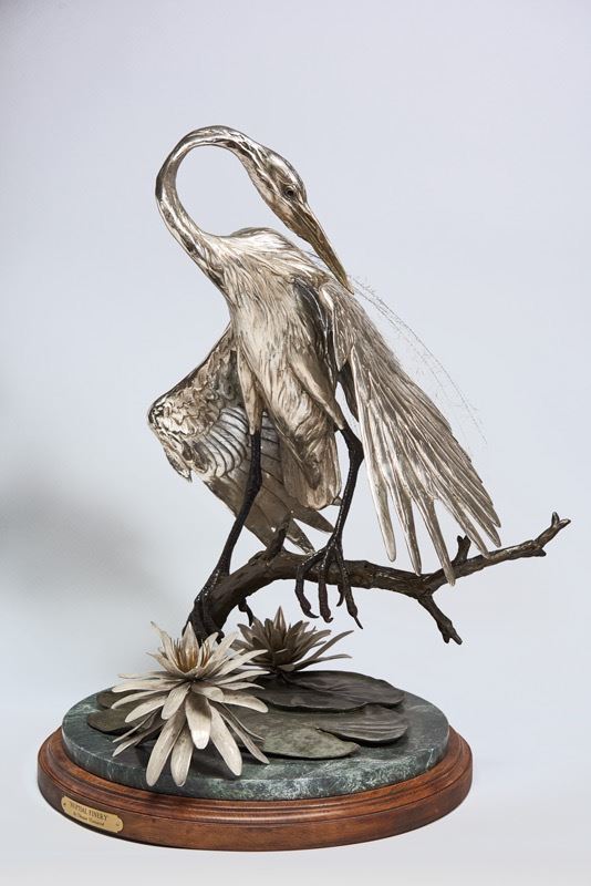 To the unaided eye, this piece appears to be in very good condition. There are no signs of damage or repair to the bronze. The surface finish is relatively consistent and free of corrosion. Some silver paint has chipped off of the wirey plumage on the back side of the egret, exposing flecks of copper. The piece is mounted on a green granite and wooden swivelling base. The base is in good condition, showing normal signs of wear.