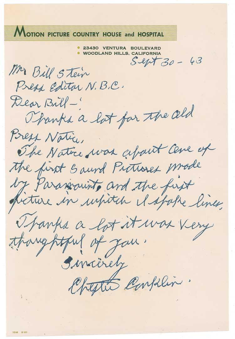 American actor (1886–1971) best known for his character roles alongside such early comic giants as Charlie Chaplin and W. C. Fields. ALS, one page, 6 x 9, Motion Picture Country House and Hospital letterhead, September 30, 1963. Letter to the Press Editor of N.B.C. In part: “Thanks a lot for the old press notice. The notice was about one of the first sound pictures made by Paramount, and the first picture in witch [sic] I spoke lines.” In fine condition. Pre-certified PSA/DNA and RRAuction COA.