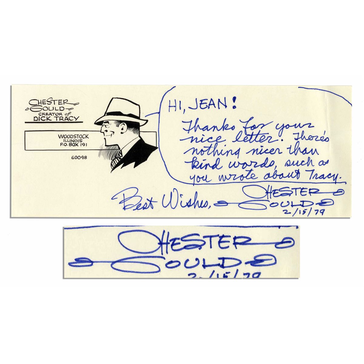 Chester Gould autograph note signed, dated 2 February 1979. Gould, who created the ''Dick Tracy'' comic strip and continued it for 46 years in the pages of the ''Chicago Tribune,'' handwrites the note on a card illustrated with the imaginary police detective to cleverly imitate a comic strip. The note reads: ''Hi, Jean! Thanks for your nice letter. There's nothing nicer than kind words, such as you wrote about Tracy. Best Wishes, Chester Gould / 2/15/79''. 9'' x 3.5'' card shows minor creasing, else very good.