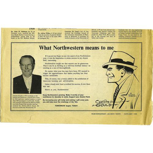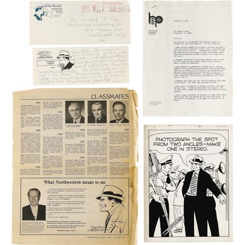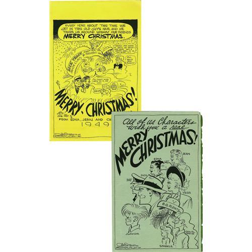 <B>Chester Gould - Dick Tracy Christmas Card, Group of 12 (1946-54).</B></I> Over the years, <I>Dick Tracy</B></I> creator, Chester Gould, created and produced a variety of yearly Christmas cards, featuring both his real family, and the family of characters he created for the funny pages. Included in this lot is a selection of twelve unique cards, the earliest dated card is from 1946 (many are undated). They feature Chester Gould, and his wife, Edna, and their daughter, Jean, along with Tracy, Pat Patton, Tess, B. O. Plenty, Junior, Sparkle Plenty, and Gravel Gertie, and are printed in black or colored ink, on various colored papers (including a gold paper). The cards range in size from 5.5" x 7.5" up to 5" x 14.5", and average in Very Good condition. This group also includes correspondence to and from Chester Gould from 1981 (in Very Good condition), an exhibition catalog for "The Cartoon Show," which was held at the University of California (undated, in Good condition), and a <B>Northwestern Alumni News</B></I> clipping featuring Gould (apparent aging, in Good condition). <BR><BR><B>Important notice:</B> Heritage usually auctions material at the rate of 200-250 lots per hour. On some occasions eBay Live bid software or the Internet may not be able to keep up with the pace of the auction. We recommend placing a realistic absentee bid now as insurance to avoid disappointment. Occasionally the auctioneer may eliminate or reject an eBay Live bid, and the auctioneer may also reopen a lot after the close of the eBay live bidding (usually because we missed an audience bid), and may reject your bid even if it shows you as the winning bidder. By bidding via eBay Live, you agree that Heritage may award the lot to another bidder at its sole discretion under the circumstances described above or any other reasonable circumstances. Since eBay bids are not shown to us until we open the lot on the floor, we treat those bids just like floor bids. In most cases the floor responds before the eBay bid is presented to us, due to Internet lag time, so for consistency we have made it a policy that floor bids are always considered first over tie eBay live bids. Also please note that all Heritage lots purchased through eBay Live carry a 22.5% Buyer's Premium. Please make sure you read the Terms and Conditions before you bid. This lot is being auctioned in conjunction with a live floor auction by Heritage Auction Galleries. All final auction and invoice information will be supplied by Heritage Auction Galleries, and all other information should be considered preliminary. Lot:41001 <BR><BR><B>Winning Notification and Billing:</B> After the FINAL session in this auction is complete, Heritage will send e-mail and snail mail invoices. This process normally takes several days. All final auction and invoice information will be supplied by Heritage Auction Galleries, and all other information should be considered preliminary. <BR><BR>This auction will be conducted on a live auction floor and over the Internet through eBay Live. If you choose to place an absentee bid, please take a moment to <font color='#0000ff'><u><a href='http://pages.ebay.com/liveauctions/help/before/laabsentee.html'>learn how eBay Live absentee bidding works</a></u></font><font color='#000000'>