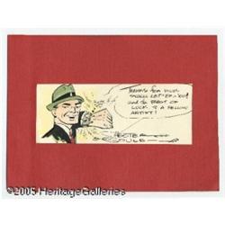 <B>Chester Gould - Dick Tracy Color Illustration Original Art (undated).</B></I> A superb fully-painted headshot of everybody's favorite cop, sent to a fan in response to a letter of comment. Man! Now we wish <I>we</B></I> had sent Chester Gould some fan letters back in the day! "Thanks for your swell letter, John! And the best of luck to a fellow artist" reads the inscription. The piece is undated, but is probably from the '50s or '60s, and it measures 9" x 3.5". The art is in Excellent condition with no tears or creases. <I>From the collection of Larry Doucet.</B></I>