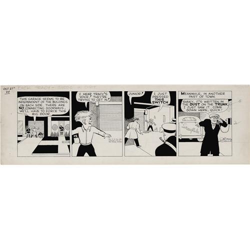 <B>Chester Gould - Dick Tracy Daily Comic Strip Original Art, dated 10-27-44 (Chicago Tribune, 1944).</B></I> Thanks to Junior, Dick Tracy is well on the way to closing in on Shakey and his gang in this well designed daily. The ill-fated Snowflake Falls is mentioned in panel three. The image area of the strip measures 20" x 6", and the art is in Excellent condition. This daily will be a welcome showpiece to any <I>Dick Tracy</B></I> collection! <BR><BR><B>Important notice:</B> Heritage usually auctions material at the rate of 200-250 lots per hour. On some occasions eBay Live bid software or the Internet may not be able to keep up with the pace of the auction. We recommend placing a realistic absentee bid now as insurance to avoid disappointment. Occasionally the auctioneer may eliminate or reject an eBay Live bid, and the auctioneer may also reopen a lot after the close of the eBay live bidding (usually because we missed an audience bid), and may reject your bid even if it shows you as the winning bidder. By bidding via eBay Live, you agree that Heritage may award the lot to another bidder at its sole discretion under the circumstances described above or any other reasonable circumstances. Since eBay bids are not shown to us until we open the lot on the floor, we treat those bids just like floor bids. In most cases the floor responds before the eBay bid is presented to us, due to Internet lag time, so for consistency we have made it a policy that floor bids are always considered first over tie eBay live bids. Also please note that all Heritage lots purchased through eBay Live carry a 22.5% Buyer's Premium. Please make sure you read the Terms and Conditions before you bid. This lot is being auctioned in conjunction with a live floor auction by Heritage Auction Galleries. All final auction and invoice information will be supplied by Heritage Auction Galleries, and all other information should be considered preliminary. Lot:41001 <BR><BR><B>Winning Notification and Billing:</B> After the FINAL session in this auction is complete, Heritage will send e-mail and snail mail invoices. This process normally takes several days. All final auction and invoice information will be supplied by Heritage Auction Galleries, and all other information should be considered preliminary. <BR><BR>This auction will be conducted on a live auction floor and over the Internet through eBay Live. If you choose to place an absentee bid, please take a moment to <font color='#0000ff'><u><a href='http://pages.ebay.com/liveauctions/help/before/laabsentee.html'>learn how eBay Live absentee bidding works</a></u></font><font color='#000000'>
