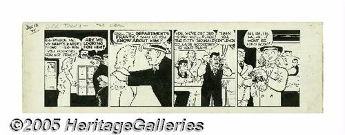 <B>Chester Gould - Dick Tracy Daily Comic Strip Original Art, dated 1-12-44 (Chicago Tribune, 1944).</B></I> Instead of rubbing out Dick Tracy for a fee of five G's, Flattop took Tracy hostage and used him to extort <I>ten times</B></I> that amount from the crime bosses who had ordered the hit. Out of all the players in this deadly drama, Tracy acts the coolest! The daily has an image area that measures 20" x 6" and the art is in Excellent condition. <I>From the collection of Larry Doucet.</B></I>